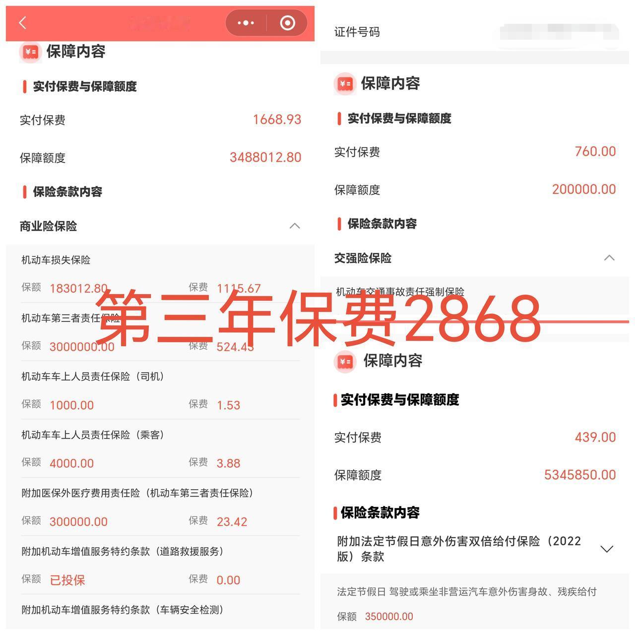 我的车型是本田冠道240TURBO智享版,目前已开三年,今天保费2868元,购买了交强险、车损险、三者责任险(300万),以及驾乘险。作为一个买过三年保险的老司机,分享一些保险购买经验。 一、车险公司选择 首推选择大牌保险公司,大牌公司服务好,理赔快,遇到扯皮的情况一般也能胜诉,买它们的车险比较安心。 二、险种选择 这个就因人而异了,我是买的比较全的那种,提供全面的保障,但有些险种在某些情况下也可以不买或低买。 1. 交强险 这是必须购买的,不买车就不能上路,交强险是"给别人买的",就是开车伤到他人或其他车,交强险可以赔付,但赔付额很低,最高1.5万左右。这个险种全国价格统一,一般700-800元。 2. 三者责任险 这个也是"给别人买的",可以理解为加强版的交强险,买的越高可以赔付的金额越高,有100万、200万、300万甚至500万,依据个人的用车频率、道路车辆情况来买,每天都要开车的,路上车又多,或者车位旁经常停豪车的,建议买高一点,否则出了事保险都不够赔;如果平常开车少,道路又通畅的,100万保额就足够了。 3. 车损险 这是给自己车买的,车辆发生损坏、被盗等情况,保险公司会给予理赔,但根据损坏部位、损坏原因的不同,又细分为很多险种,所以理赔的时候并不一定会成功,这个如果车不是特别贵重,或者使用场景安全,可以选择不买,可以省几百甚至几千,依车价而定。 4. 驾乘险 这是给车上每个座位上的人买的,包括自己。前面的险,都不是为我们自己的安全考虑的,所以驾乘险我觉得一定要买,保的是自己和乘客的安全,价格根据保额的高低有所区别,但一般1000块以内都能搞定。 三、省钱避坑经验 不同的保险公司,车险价格计算的公式不同,但都会根据前几年出险情况、车辆新旧、甚至我们的违章、医疗记录来判定。所以,最好的省钱方式就是尽量不出险。同时,认准我上面所说的四个险种,交强险、驾乘险要买,三者险和车损险可以少买或不买,这样可以剩下上千元。 其它保险业务员推荐的险种,就不用过多考虑了,大概率是为了坑你的钱。同时,避免购买小保险公司的车险,他们的价格虽然相比大公司便宜几百块,但服务质量、理赔难度、维修靠谱程度不可相提并论,买保险就是为了避免麻烦,不要因为贪便宜把自己带入更大的麻烦。 四、购买方式推荐 车险可以在保险推销员那儿买,可以在官网上直接买,也可以在4s店或修理店买,我推荐在4S店买,虽然可能比其它方式贵一点,但车辆维修、换件更有保障,出事故了4S店反映也更迅速,因为他想要你在他那儿修车。其它方式购买就不清楚它绑定的是哪家修车店、修车质量如何了。 以上就是我购买保险的经验,希望对大家有帮助!【来自懂车帝车友圈】
