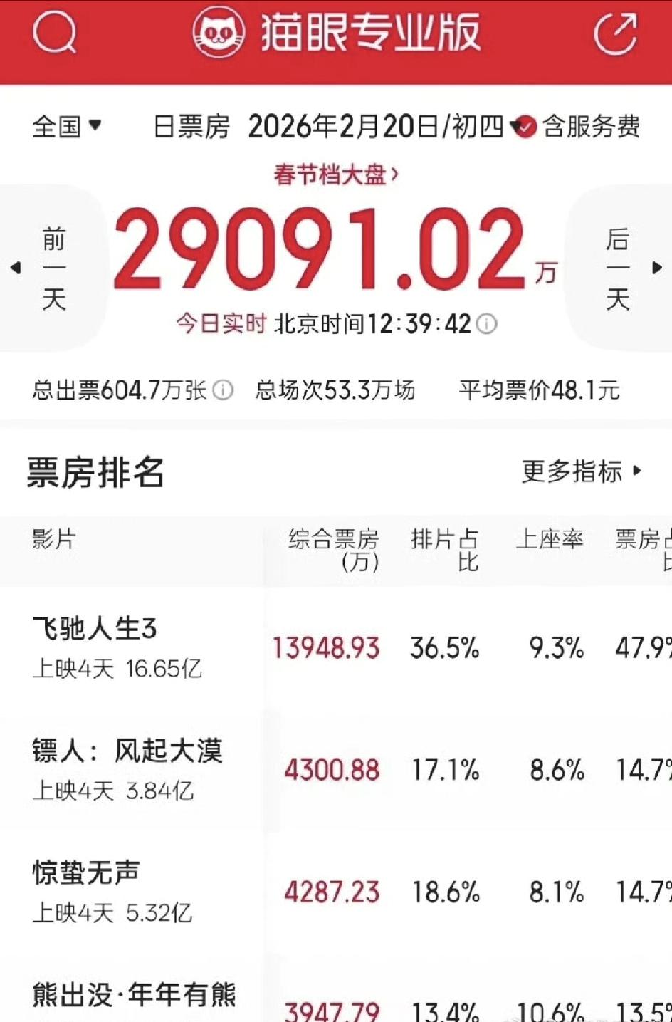 镖人成为春节档票房唯一逆袭影片, 从上映开始的第四今天跃为第二, 初三超过了熊出没, 初四超过了惊蛰无声, 票房已经破4亿, 豆瓣评分7.5,和飞驰人生3持平, 这么大阵仗的武侠大片,终于还是得到了观众的认可,吴京可以开心了, 武侠片还是有市场的! 影片中的年轻演员,此沙,于适和陈丽君,都可以接棒武侠片了,尤其是此沙,虽然是反派演员,武打功底和演技都让人惊叹,牛! 陈丽君首次出演武侠片也是很让人惊艳,今后还是多拍电影吧!镖人票房 陈丽君 此沙