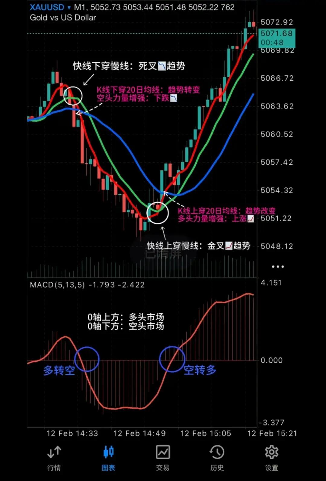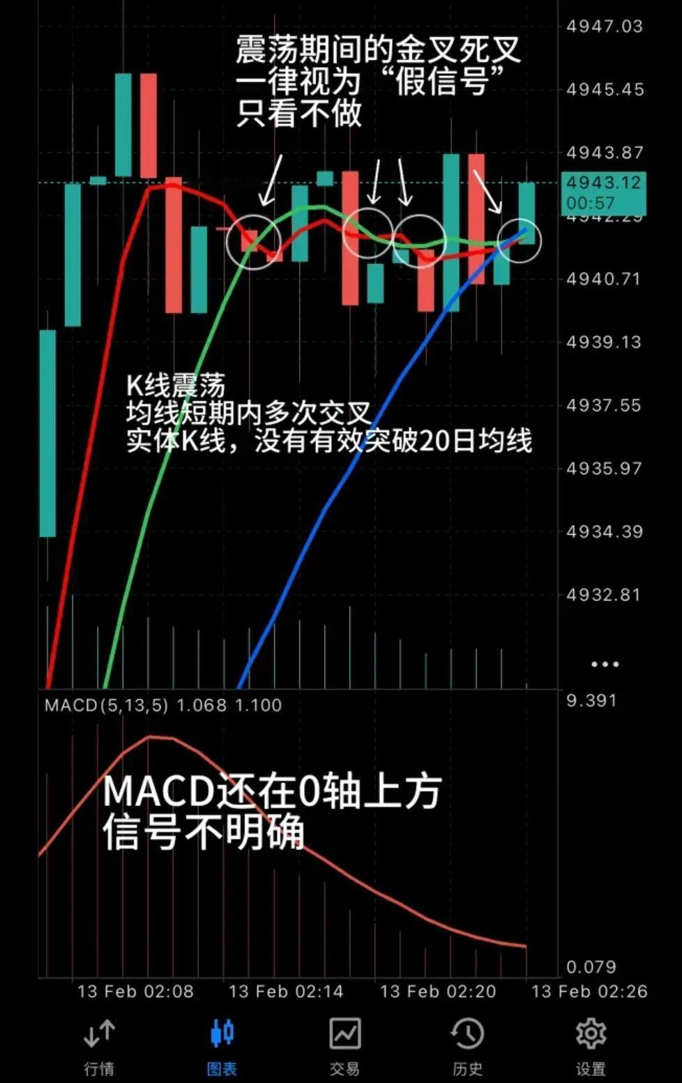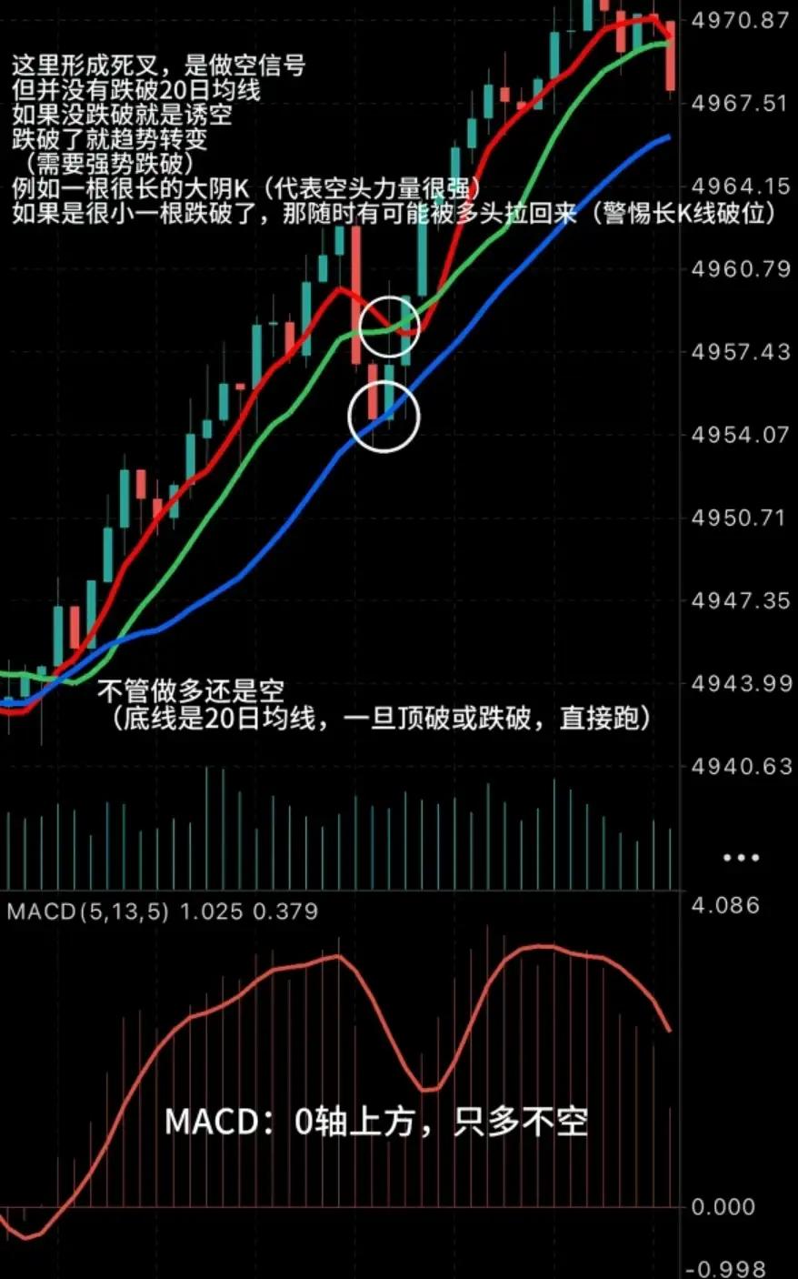 用20日均线定趋势,MACD辨多空,K线实体验信号,拒绝假突破。 1. 20日均线定方向:K线站稳且均线上行=多头(只多不空);K线跌破且均线下行=空头(只空不多)。不破均线则信号无效。 2. MACD看0轴位置:0轴上金叉=强多,死叉=回调(不破均线可多);0轴下死叉=强空,金叉=反弹(不破均线不空)。0轴附近震荡=无信号。 3. K线验信号强度:大实体突破/跌破均线=真信号;小K线刺破后收回=诱多/诱空,需等确认。破20日均线必止损。 心法:耐心等趋势明朗,不做震荡市,趋势明确敢出手。
