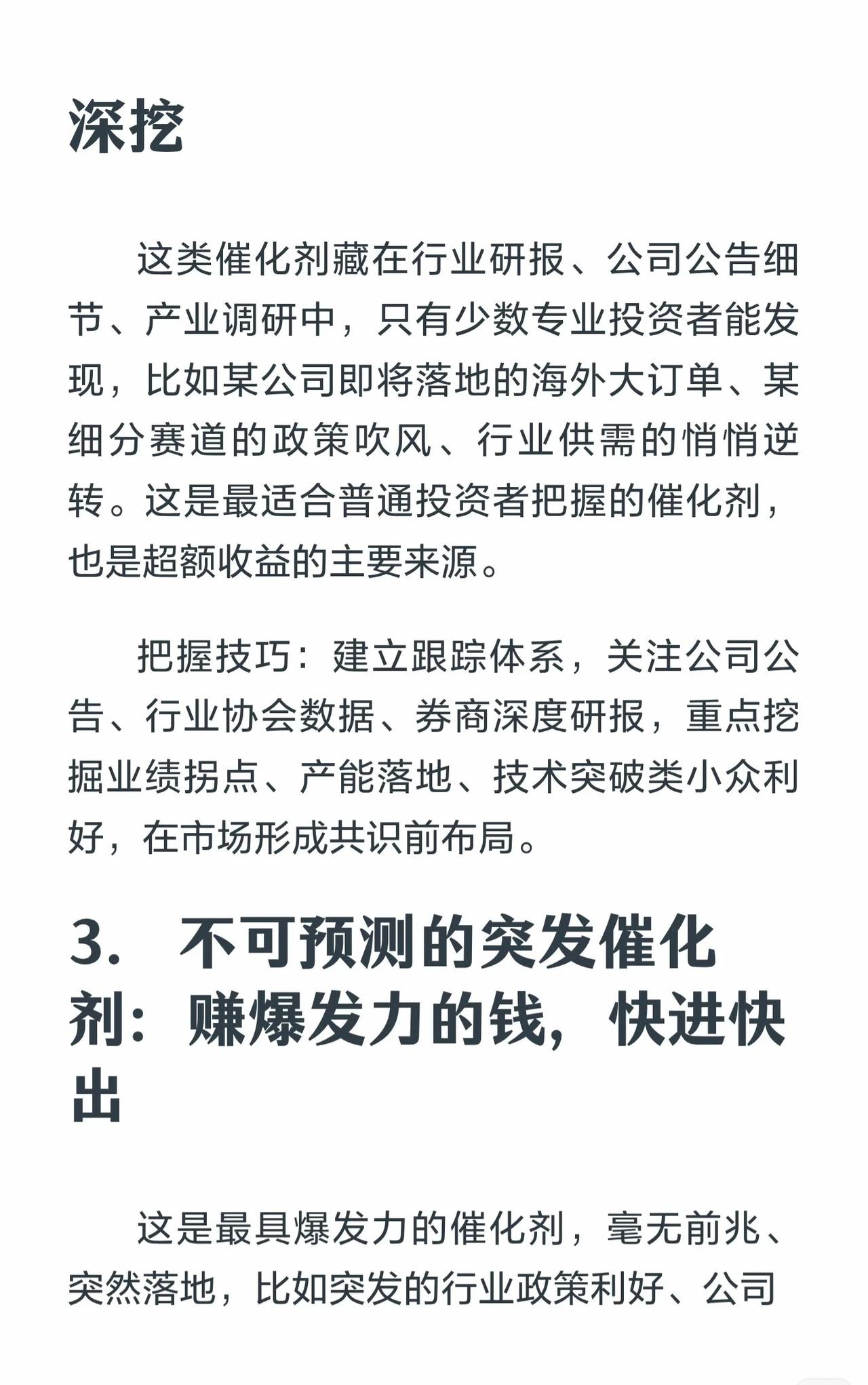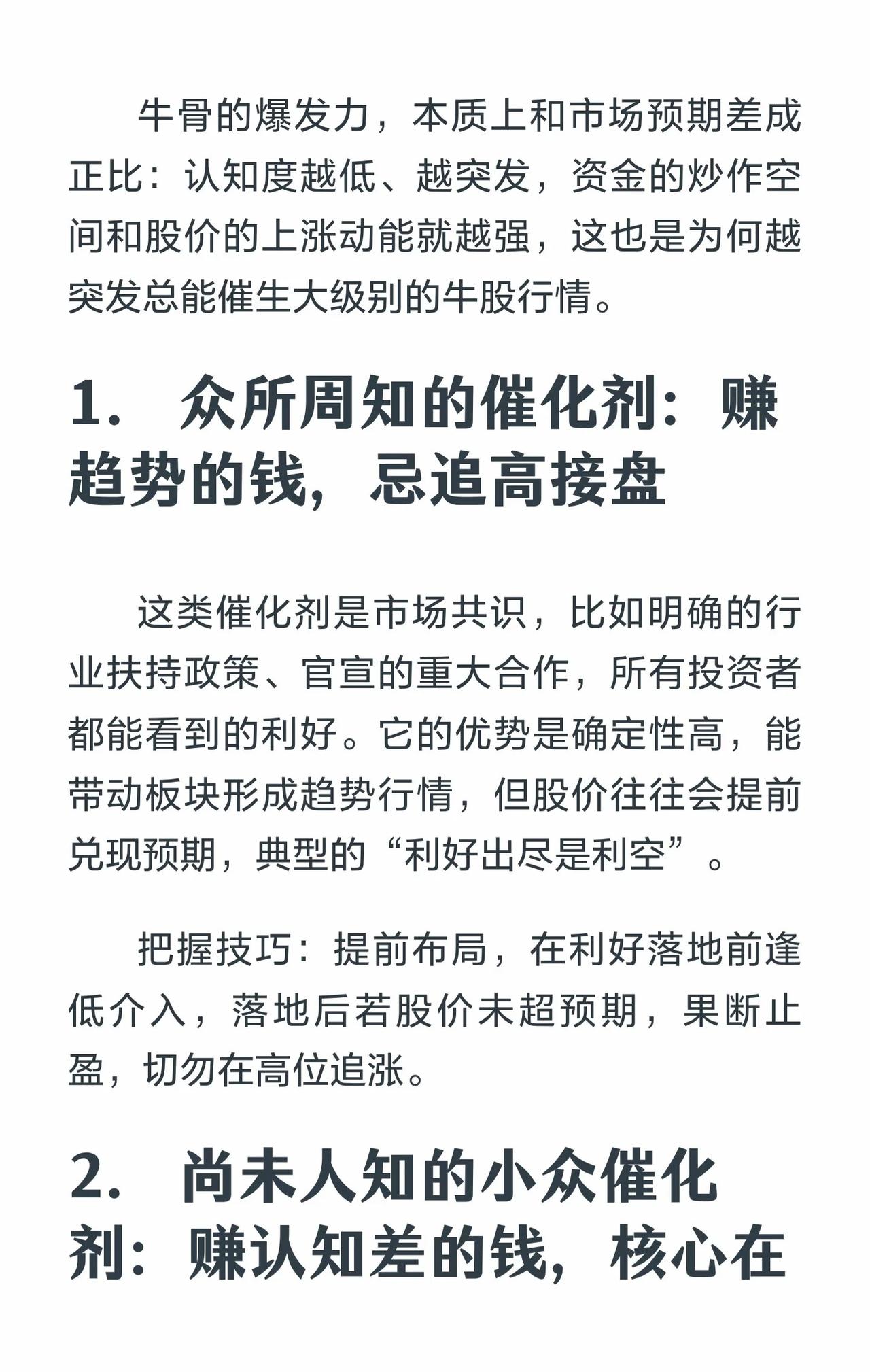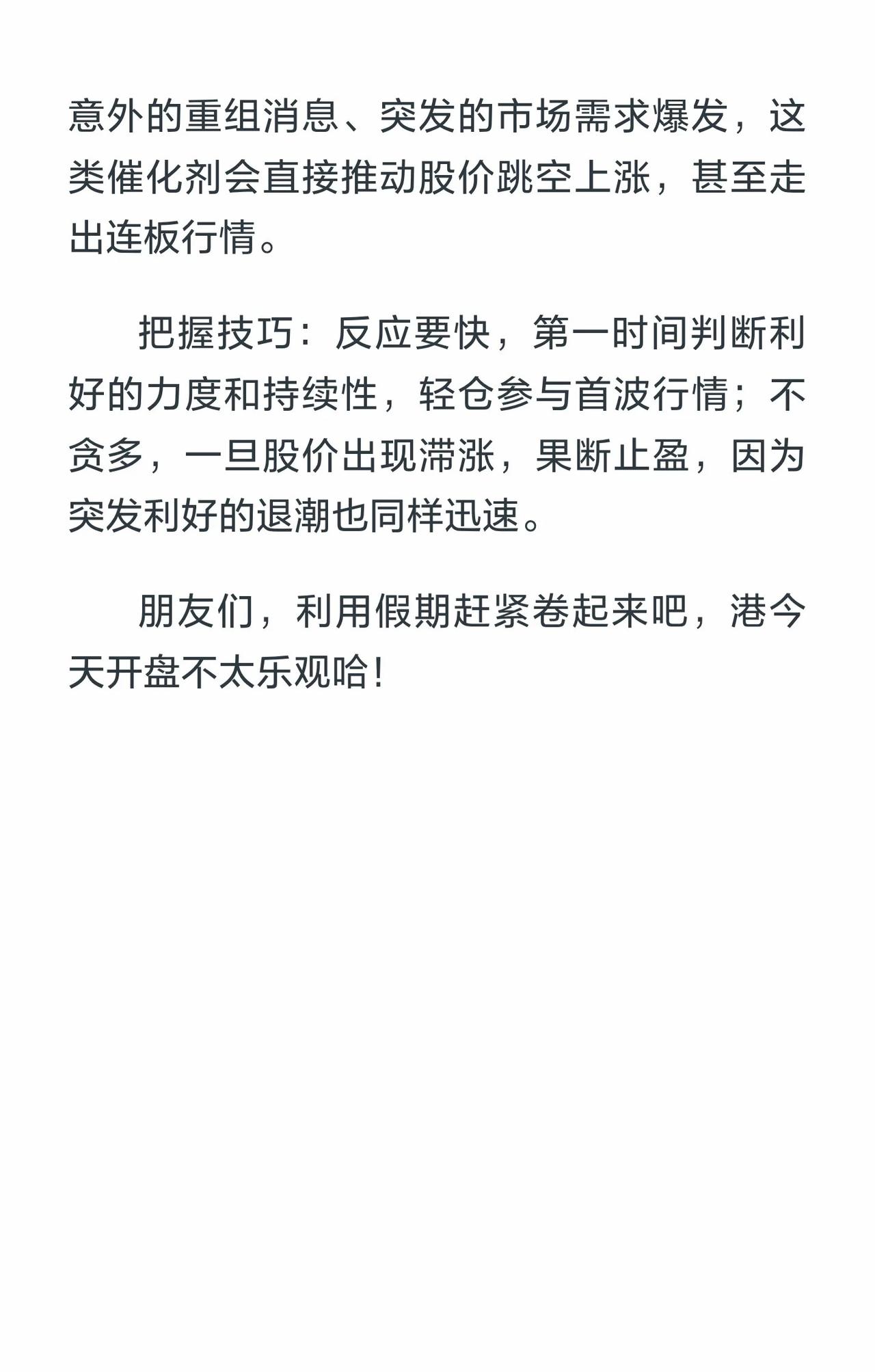 围绕“牛股起爆核心逻辑”展开,核心是抓市场预期差,分三类催化剂及操作要点: 1. 已知催化剂:市场共识(如政策/合作),提前布局、利好落地前低吸,落地未超预期则止盈,忌追高。 2. 小众催化剂:藏研报/公告等细节(如业绩拐点/海外订单),建跟踪体系,共识前布局。 3. 突发催化剂:无预兆(如重组/需求爆发),快进快出,轻仓首波,滞涨即止盈。最后提醒利用假期准备,港股当日开盘不乐观。