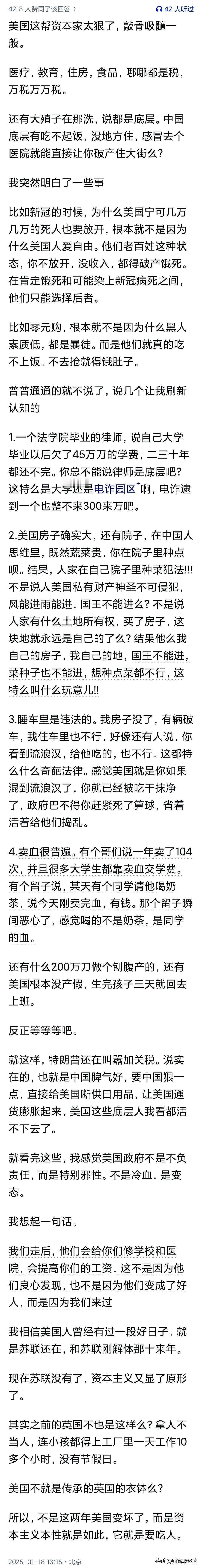 对账之后有点懵了,美国政府现在有30多万亿的欠账,但美国政府不负责高等教育,医疗,消防,监狱,军队......他们的钱花哪里去了? 一个全球GDP第一的国家,收了全世界最多的税,却告诉你实在没钱管你的死活。 30.2万亿国债,光利息每年就要还1.2万亿。 这是什么概念? 每天睁眼,太阳刚升起来,33亿美元就已经烧完了,啥都没干。 可老百姓那边呢? 有人在卖血换生活费。 你看懂这个逻辑了吗? 不是政府没钱,是钱不在那个“该去的地方”。 加州洛杉矶的山火烧起来的时候,市长对着镜头骂街,说华盛顿不仅不给钱,还想克扣紧急拨款。 那边厢,佛罗里达的飓风刚过,灾民站在废墟上等了三天,等来一句“请先自救”。 最绝的是疫情那几年,死了一百多万人,官方口径是:“这就是人生,你得接受。” 但有一个数据,愣是让人想不通—— 美国用占世界4.22%的人口,出口了全球70%的医用血液制品。 70%。 也就是说,你在世界各地的医院里用到的血浆,每三袋里就有两袋,可能来自同一个源头:美国的穷人。 墨西哥人卡琳娜·坎图每个月都要过境一次,去美国的采血机构卖掉自己的血浆,换回120美元。 这不是一个两个。 这是年产值370亿美元的产业链,整整齐齐地建在贫民区和大学城旁边。 为什么会这样? 因为那里有人急需用钱。 因为医疗账单会把人逼疯。 因为政府的逻辑是:你穷,你就得自己想办法,我们给你“自由”。 这事不是今天才这样的。 往回看三十年。 1994年,美国推出了《北美自由贸易协定》,资本欢天喜地冲出去找廉价劳动力。 也是那一年,中国那边正在搞“菜篮子工程”。 什么叫菜篮子? 就是农技人员蹲在零下20度的温室里,每隔两小时人工记录一次温度,硬要在北方冬天种出黄瓜。 当时专家说:不可能。 后来他们干成了。 三十年后的今天,美国的血浆出口涨了十几倍,中国的蔬菜年产量奔着8亿吨去了。 两边都是解决问题,但路子完全拧着。 一边想的是:你饿,你可以卖血,血是商品。 一边想的是:菜太贵?那我把它种便宜,种到人人都吃得起。 所以当美国人惊讶地问“你们中国人居然顿顿吃得起新鲜蔬菜”的时候,我们愣了半天—— 这难道不是每天睁眼就该有的日常吗? 那个30万亿的坑,到底填在哪了? 有人算过一笔账。 如果把这笔债平摊到每个美国人头上,每个人要背9万美元。 但你背了这笔钱,换来的却是:大学学费自己凑、救护车自己叫、山火来了自己跑。 钱去哪儿了? 国防预算年年涨,航母满世界转。 药企的利润高到离谱,一盒胰岛素卖三百美元。 华尔街的奖金照发,高管们坐着私人飞机去度假。 所以这不是钱的问题,是分钱的逻辑出了问题。 一套成熟的制度,核心功能应该是“托底”。 你生病了,有人管;你穷,有饭吃;你倒霉遇上灾,有地方躲。 但如果你把这套东西全砍了,告诉每个人“你自由了,你自己搞定”,那最后能活下来的,一定是那些不需要托底的人。 剩下的人怎么办? 卖血。 卖时间。 卖命。 有一个细节,一直没人细说。 那些每个月来六次采血机构的“常客”,除了换钱,还有一个盼头:抽奖。 机构搞活动,来够次数可以抽,奖品是200美元购物卡。 有人专门算过,为了抽中这张卡,平均要献多少次? 33次。 33次换一张200块的卡。 就这,还有人排着队往里冲。 结尾反问一句: 当一个人只能用自己的血去换活着的资格时,他投出的那张选票,到底还能“做主”什么? 是帮他免掉下一张医疗账单? 还是让血浆的价格再涨5%? 30万亿的账,迟早要还。 但比还钱更难的,是让那个“不负责”的逻辑,停下来。