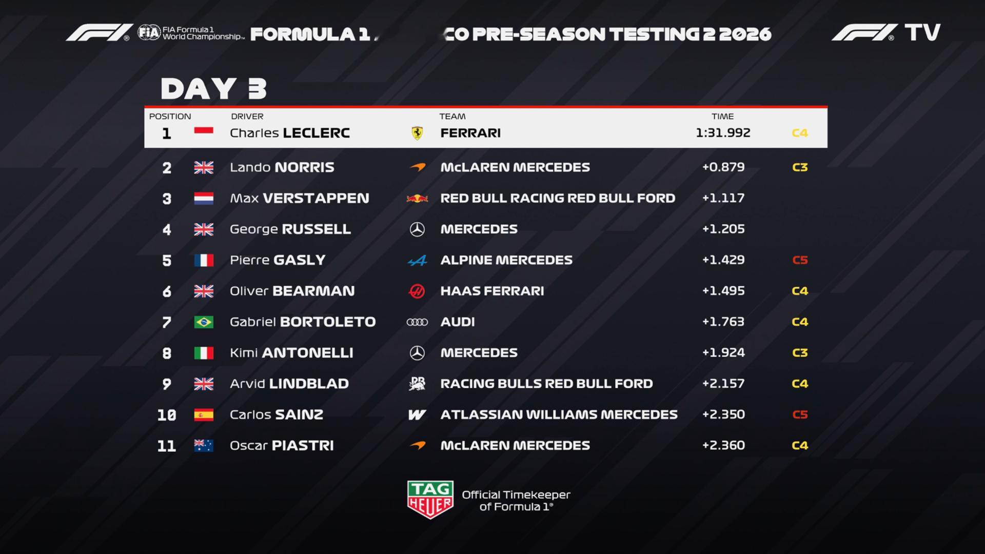 F1巴林冬季测试第二轮Day3:勒克莱尔最快,诺里斯P2,维斯塔潘P3