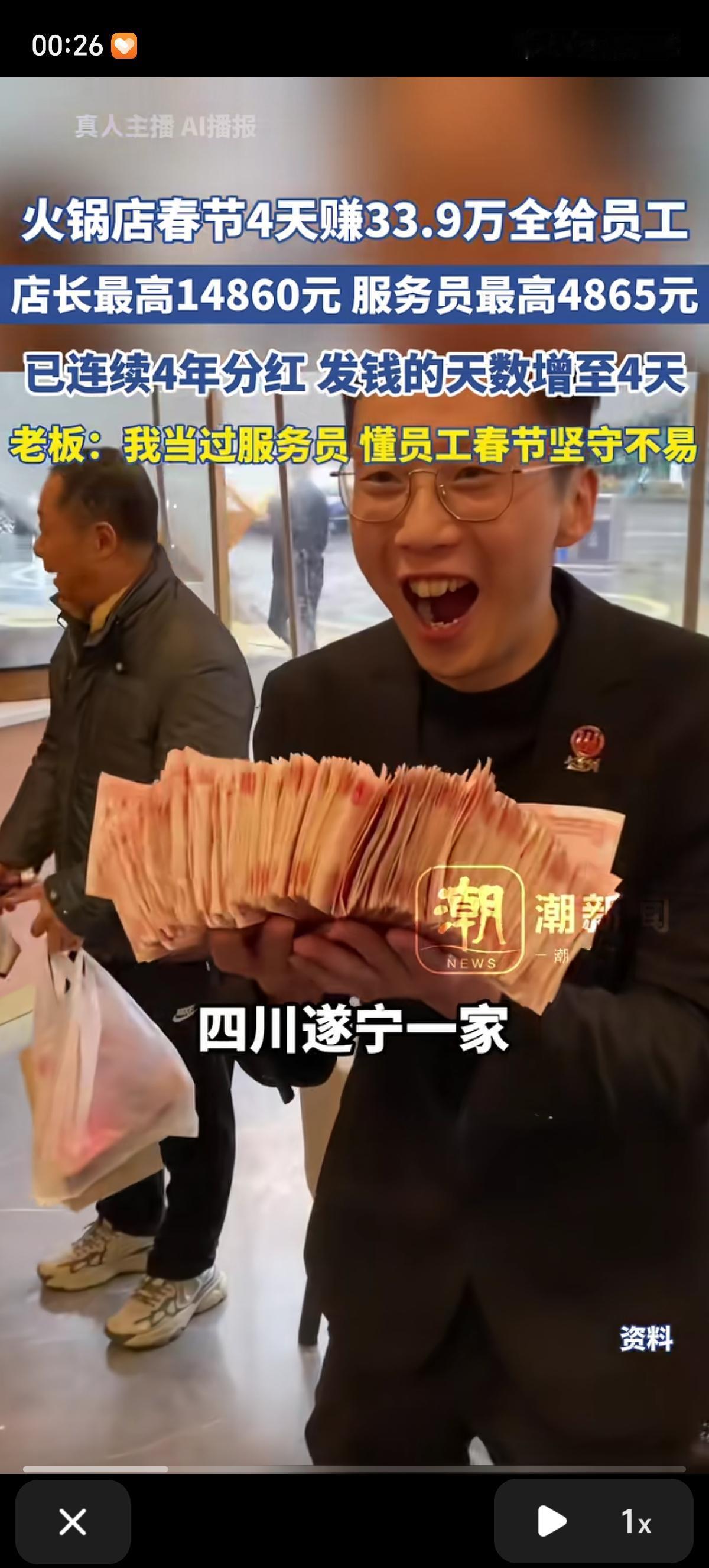 四川七里川火锅店春节4天赚33.9万元全给员工,店长最高拿到14860元,服务员最高拿到48685元,就连保洁阿姨都拿到了1447元。 四川遂宁七里川火锅店老板黄厚明的暖心举动已经连续坚持了第4年。在春节期间给员工分红,把除夕到初二的利润分给员工。 尽管今年行业环境艰难、利润有所减少,他反而把分红天数从3天增加到了4天。四年累计分红金额已突破150万元。 黄厚明表示,自己年轻时也做过服务员,深知春节期间员工坚守岗位、无法与家人团圆的不易。除了春节分红外,他还为员工缴纳五险一金,每月发放“父母孝顺金”(管理层500元、员工300元,直接打入父母账户),并严格执行双休与法定假期。 不得不感叹一句,会发钱的老板都是别人家的,这种好事应该让自己的老板多瞅瞅,好好学习学习[捂脸][捂脸][捂脸]