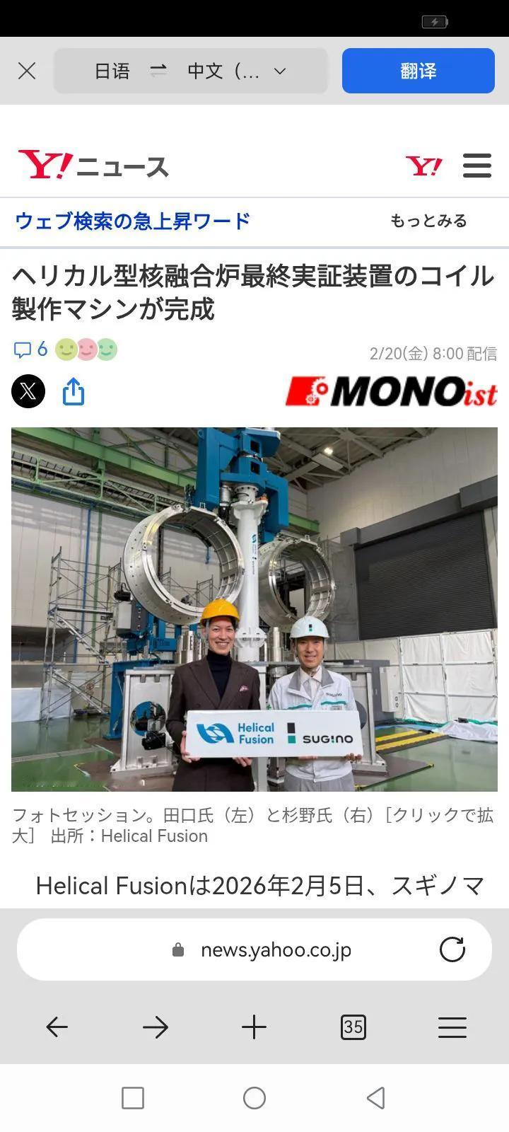 日本公司也在积极研发核聚变相关技术。 据日媒报道称,Helical Fusion于2026年2月5日在杉野机械的早月事业所(富山县滑川市)并通过线上举办记者会,宣布通过与杉野机械的技术合作和开发,完成了制造螺旋型核聚变反应堆最终验证装置“Helix HARUKA”的最重要组件之一——“高温超导线圈”所需的线圈制造机器。 螺旋聚变反应堆由一个螺旋线圈(高温超导线圈)、等离子体和一个孔隙线圈组成,利用多个螺旋线圈在1亿°C下捕获氢气(等离子体)。 虽然其等离子体性能不如托卡马克型,但其等离子体保留时间较长,适合永久运行。 通过将螺旋线圈本身塑造成螺旋形,电流产生的磁场被叠加并扭曲。 因此,将等离子体约束在磁场篮子中的方法称为“磁场约束法”。 螺旋聚变的高温超导线圈是一种强力电磁铁,无需绝缘体,使用多个高温超导磁铁,在沸点高于液氮的沸点下表现出超导态。 这套装置组装时间约为1年。  杉野机械是一家开发、设计、制造并销售工业机械、机床、工具、超细纤维材料、工业机器人及这些服务的公司。 公司总裁杉野岳先生表示:“我们的管理方针是成为'全球细分市场领导者'。 基于这一理念支持业务发展的是“六大超级技术”。 六大超级技术包括使用各种设备、工具和机器进行切割、清洗、破碎、刮除、抛光和松动技术。 利用这些技术,我们完成了生产高温超导线圈所需的线圈制造机。” 卷材制造机高约6米,直径约4米。 杉野先生说:“我们于2023年12月接到订单,负责设计和制造线圈制造机。 该机器采用螺旋聚变独特的'易弯曲高温超导导体'螺旋形,优化于快速平稳的螺旋旋转,是一根高温超导线圈。” 在能源市场,公司负责生产用于热交换器、锅炉等生产和维护的工具和设备,这些设备对保持能源效率至关重要。 因此,在涉足能源市场期间,我们收到了用于核电站维护和维护的设备、设备和技术的制造请求,并开发并向用户提供。 此外,公司还利用迄今为止积累的技术,开发与聚变相关设施相关的设备和工具。 Helical Fusion的CEO兼CEO田口隆也表示:“我们之所以委托杉野机械制造线圈制造机,是因为我们对核电厂的业绩和信任。 该机器将被运送到Helix HARUKA的建设现场并使用。 田口说:“未来,我们预计需要更先进的线圈制造设备以用于更大型的商用炉。” Helical Fusion迄今为止的努力 近年来,除了需要应对能源需求的增加和脱碳,日本的能源自给率仅为15%,相比美国、中国和德国等国家较低。这些问题的解决方案之一,便是核聚变发电。田口表示:“核聚变发电受到关注的原因有几个。例如,CO2排放量为零,以及燃料氘可以从海水中获取。与利用核裂变反应的核能发电不同,不会产生高放射性废物,理论上也不会发生连锁反应导致失控事故,这也是其优点。” 此外,他补充道:“与可再生能源相比,其优势在于占地紧凑、不会受到天气影响,并且能够在一年中稳定发电。” 核聚变发电是一种利用氢同位素在超高温、高密度下产生核聚变反应并释放巨大能量用于发电的下一代发电方式。具体而言,将氚和氘在超高温、超高压下加热成等离子体状态,使两者的原子核碰撞结合产生核聚变反应并释放中子,然后通过毯子从中提取热能用于发电。 Helical Fusion基于核聚变研究所和京都大学等的技术基础,推进使用螺旋型核聚变反应堆的商业发电厂实用化计划“Helix Program”。Helix Program以“在日本再建一个太阳”为理念,计划在2030年代前期完成螺旋型核聚变最终实验装置“Helix HARUKA”的建设并完成验证,并在2030年代后期对50MW~100MW发电的螺旋型核聚变首台机“Helix KANATA”进行试运行和商业发电。 公司已经用小型装置完成了螺旋型核聚变反应堆的概念验证,并利用大型螺旋装置(LHD)达成了等离子体温度1亿℃、等离子体保持时间超过3000秒的成果。高温超导磁体的个人验证也已完成。毯子兼偏流器仍在开发中。剩下的主要课题是开发完成毯子兼偏流器,以及建设用于综合验证的螺旋型核聚变反应堆Helix HARUKA和可进行稳定/净发电的核聚变反应堆“Helix KANATA”。