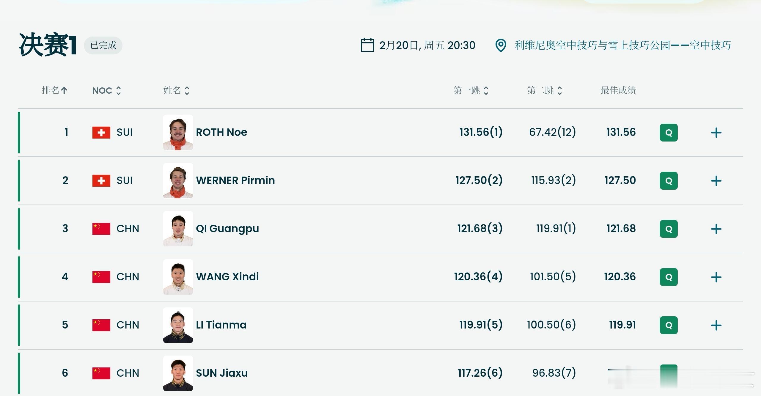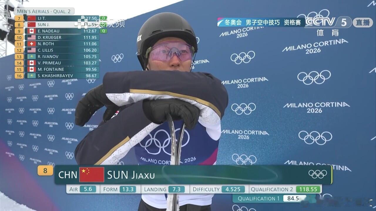 四中国选手晋级空中技巧奖牌轮2026冬奥会自由式滑雪男子空中技巧决赛,中国队四名选手全部晋级决胜轮!