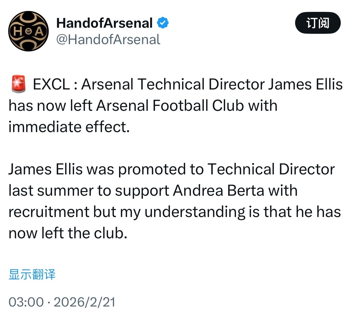 HandofArsenal独家消息:阿森纳技术总监詹姆斯·埃利斯已离开阿森纳。去年夏天,詹姆斯·埃利斯被提拔为技术总监,协助贝尔塔进行引援工作,但据我了解,他现在已经离开了。