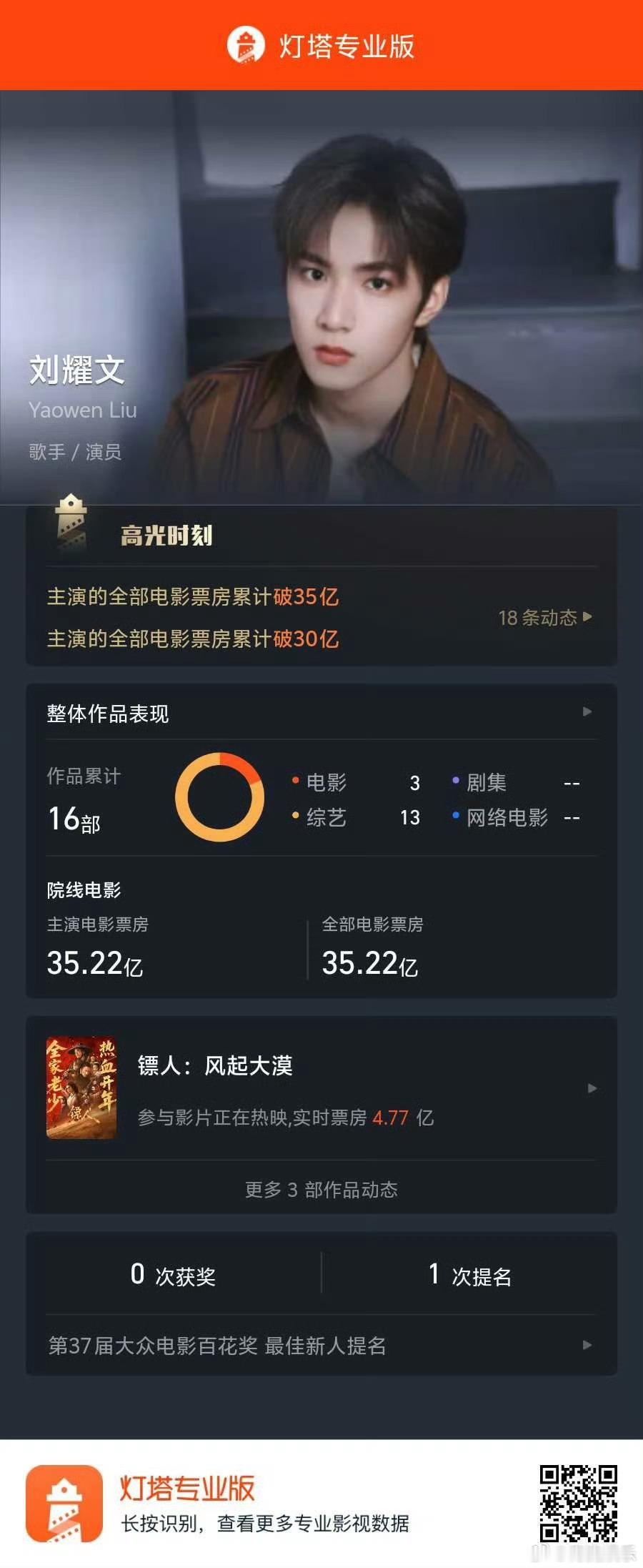 刘耀文主演票房破35亿 据灯塔专业版数据,主演电影累计票房已破35亿。影片《惊蛰无声》《镖人》正在热映中!春节现实娱乐指南刘耀文