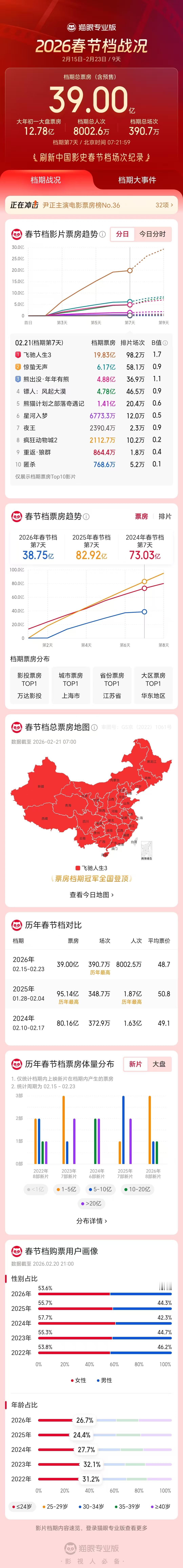 2026春节档票房破39亿 据猫眼专业版数据,2026年春节档档期总票房(含预售)破39亿,《飞驰人生3》《惊蛰无声》《熊出没·年年有熊》分列前三位。