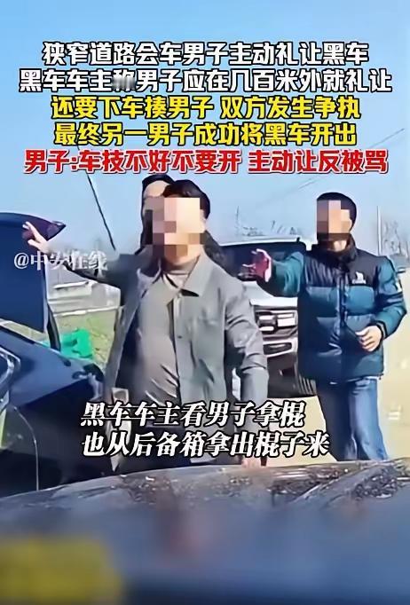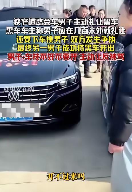 “我都让成这样了,你还开不过去?”江苏男子主动把车轮开下田埂让道,竟遭后车辱骂还拿棍子! 开车上路,最怕遇到什么样的人?不是新手,不是路怒,而是那种明明自己技术不行,还非得怪别人没让够的人。 江苏一位男子最近就摊上这么个糟心事。他开车带着家人走在一段窄路上,这种路咱们农村经常见——水泥路面就那么宽,两辆车根本错不开,好在路边有个地势低的土路,可以借借光。正走着呢,迎面来了两辆车,男子往后视镜一瞄,自己后头没车,心想:得,我给人家让让吧。 于是人家直接把半边车身开下水泥路面,一侧车轮都扎进田埂土路上了。这觉悟,够高了吧? 可接下来发生的事,让人大跌眼镜。 对面那辆黑色大众开到男子跟前,停了。司机和后排一个女乘客摇下车窗,张嘴就是一顿数落,说男子让的路太窄,他们过不去。男子当时就懵了,自己都让到田里去了,还嫌窄?他特意探出头看了看两车之间的距离——明明够过啊! 男子忍不住回了一句:“我都让成这样了,你还开不过去?” 就这一句话,捅了马蜂窝。 黑车后排那女的直接跳下车,冲到男子车窗前指着鼻子开骂,什么难听话都往外蹦。男子的家属哪受得了这个,也下车理论。吵着吵着,更吓人的一幕来了——黑车司机居然从后备箱翻出一根棍子,气势汹汹往这边走。男子一看这架势,也赶紧从自己后备箱拿了根棍子,眼看就要上演全武行。 这时候,后面来了几辆车,司机们一看这阵仗,赶紧下车拉架。一边劝一边说:“别别别,多大点事,咱把车过过去不就完了?”在几位司机的指挥下,黑色大众左一把右一把,终于蹭过去了。 搞笑的是,这黑车刚走,后面几辆车一辆接一辆,嗖嗖就过去了,根本不用人指挥。 有网友评论:技术不行,嗓门来凑。这话一点不假。 其实咱们得说说这里头的法律问题。根据《道路交通管理条例》第四十九条,在没有划中心线的窄路会车,有让路条件的一方应该让对方先行。男子后方无车,主动让行,合情合理又合法。反倒是黑车司机,自己技术不过关,还辱骂他人,这已经触犯了《治安管理处罚法》。更严重的是,从后备箱拿棍子这个动作,性质就变了——持械威胁他人,这要是报了警,轻则拘留罚款,重了可能构成寻衅滋事。 所以啊,开车上路,遇事别上头。您说是不是? (来源:综合网络视频报道)