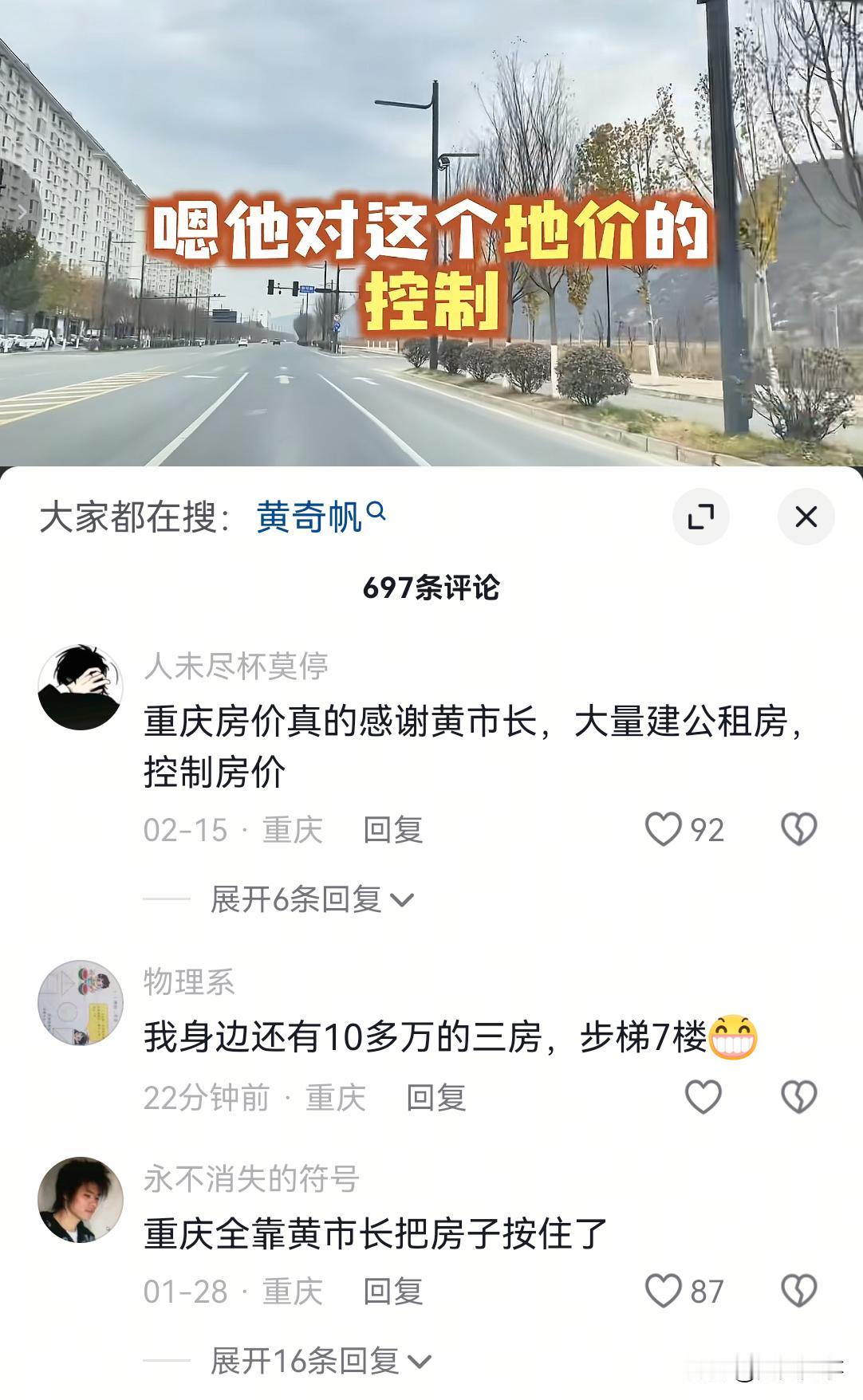 刚刚刷视频,看到一个关于重庆房价的。在评论区有个很有意思的现象:很多带着四川IP的评论,说重庆是山咔咔,怎么搞也弄不成平原城市,工资也低,所以房价才低。同时,他们对成都房价比重庆高一倍感到很自豪;而重庆IP的评论,则纷纷感谢当初的黄老,说是他制定的政策让重庆保持了低房价,让市民能够以一个相对合理的价格拥有自己的房子。同时,重庆人对重庆拥有大量的公租房、经济适用房持欢迎和感谢的态度。很多新重庆人都是在那些租金便宜的房屋里过渡,然后存下钱来买房、结婚生子的。他们感谢重庆让他们可以孤身一个人来重庆,通过自己的努力有了一个家。都说重庆的工资低,其实跟周边城市相比,大家都处于同一个水平线上。反而是重庆的制造业更发达,能容纳更多的就业人口。而重庆的低房价,让这些打工人,仅凭夫妻二人的努力,就能让他们在重庆买房安家。所以居住在重庆的人,他们对重庆的低房价普遍是感谢的。当然,那些有好几套房产的人,肯定是巴不得房价越高越好。但是其实也无所谓,因为他们早就不靠那些房子生活了。至于山咔咔?山城是重庆的特色,也是重庆人的骄傲。从这个春节重庆的游客居全国第一来看,说明全国人民也都喜欢这个山咔咔的城市。所以房价低,在重庆人看来,从来不是什么缺点,而是一项福利!