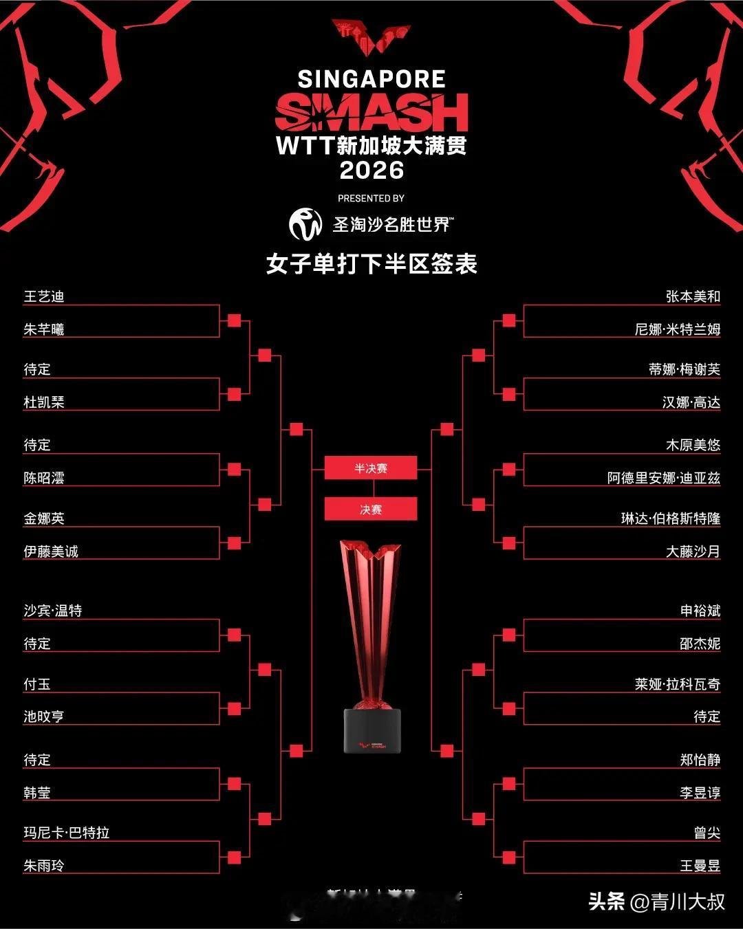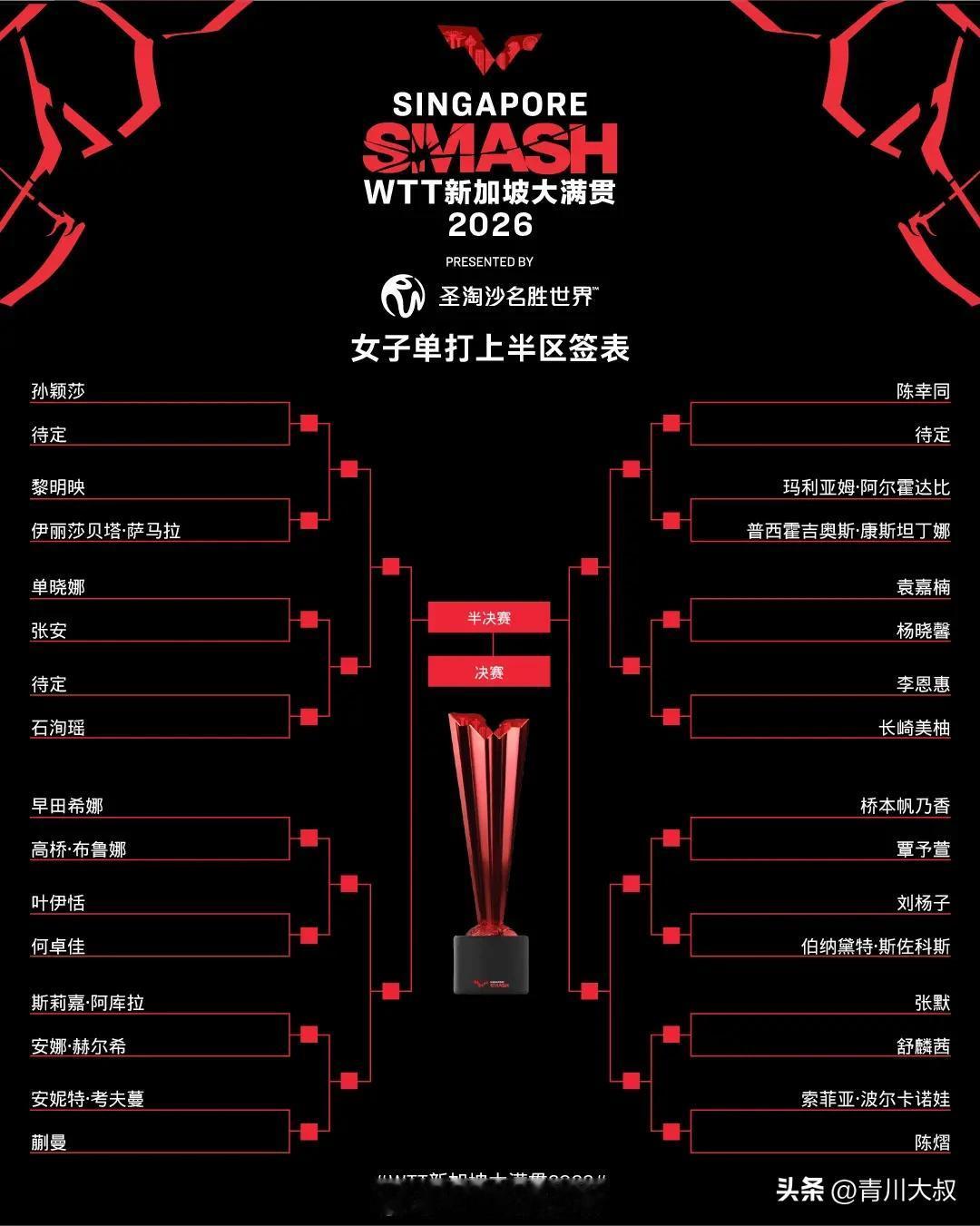 新加坡大满贯最难的签位是陈熠! 覃宇轩根本防不住桥本帆乃香, 而陈熠最怕的也是削球手, 去年遇到韩莹已经连输了! 而同同最怕的同样是削球手, 我记得上次同同赢韩莹, 还是打到了数板子, 而比韩莹更难缠的桥本, 同同赢的概率更低! 我预测孙颖莎和桥本帆乃香可能再相遇!