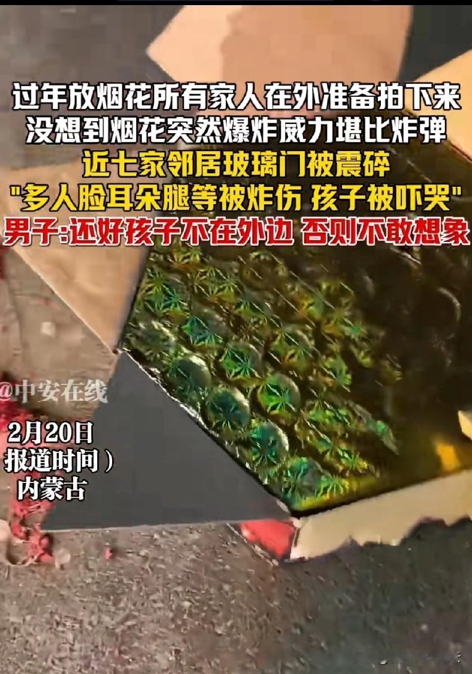 太吓人了!内蒙古一户人家过年放烟花时,烟花的威力堪比炸弹,吓得在外准备拍摄视频的人纷纷逃窜。但还是有多人的脸、耳朵、腿被炸伤,孩子被吓得大哭。 当事人说,谁能想到烟花的威力这么大,当时几个大人还在准备拍摄视频的。可是燃放后听到很大的动静,他们感觉不对劲,就赶紧往屋里跑,可爆炸的威力太大了,还是把门窗被震碎了,地上是一地的碎玻璃。除了他家,他们周围的六七户邻居家的玻璃也被震碎了。 唯一值得庆幸的是,当时孩子没在外面,如果孩子在外面,场面不堪设想。 博主燃放的烟花确实很大,看起来得有四五十个头。可是烟花再大,也不能发生爆炸啊,说实话,多亏没人在跟前,也算是万幸了。 我不明白了,这种本身需要严格管控安全的物品,就这样的质量,是怎么通过各部门的验收的,这种烟花流入市场,害人不浅啊! 希望有关部门好好查查吧,这关系到人民的生命安全,可不能怠慢。