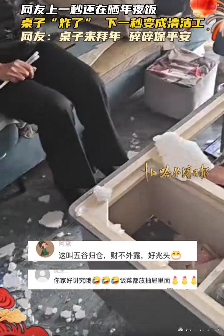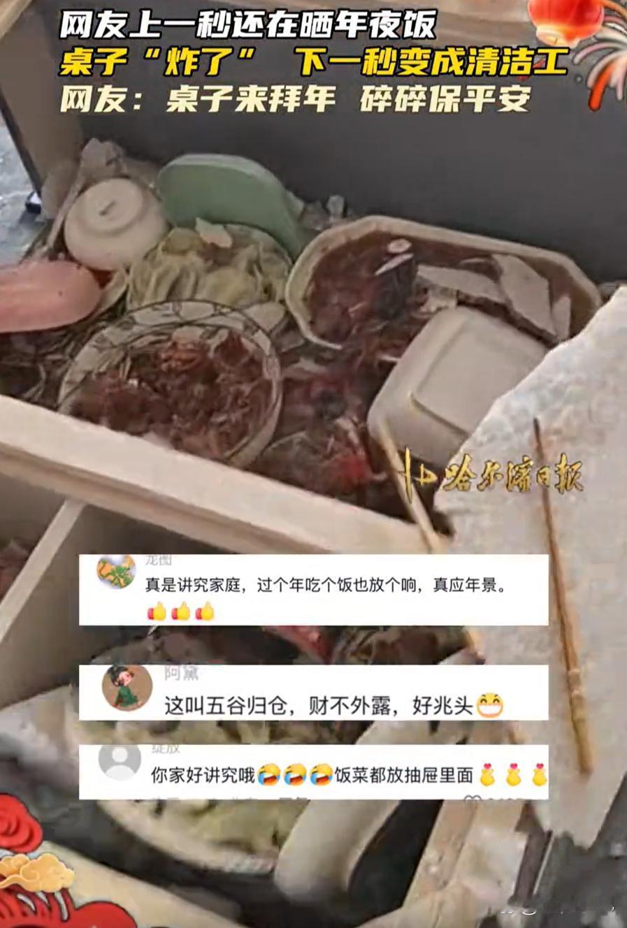 万万没想到!黑龙江,女子家里做了一桌的年夜饭,放到茶几上一口都没舍得吃,就想着先拍个照发朋友圈,不料,前一秒还好好的,下一秒餐桌就“炸了”,一桌子的菜全都白瞎了,网友:一大家白忙活一下午 当时菜已经全部端上来,还冒着热气。按家里的习惯,没人可以先动筷子。女子站在沙发上举着手机找角度,想着把整桌丰盛的饭菜拍完整,发到家族群和朋友圈,让亲戚朋友看看东北人家的年味。快门按下,画面定格。她刚说“行了行了,开吃吧”,话还没说完,突然“哗啦”一声巨响,茶几的玻璃瞬间爆裂。 桌上的菜可真不少:油亮亮的红烧肘子,酸菜白肉锅咕嘟着冒泡;炸得金黄的丸子堆成小山,还有酱骨架、锅包肉、红烧鱼,连蘸酱菜都摆得整整齐齐,绿的黄瓜、红的萝卜,看着就喜庆,还有各种凉菜。小琳看着这一桌菜,掏出手机就想拍——每年她都要发朋友圈,跟在外地上学的同学比一比,“咱东北年夜饭就是硬核”。 她站在沙发上,踮着脚调整角度,嘴里还指挥着:“爸你往边上点,挡着鱼了”“妈把那瓶红酒再往中间挪挪,好看”。拍了五六张,终于选出一张满意的,刚念叨着“开吃”,就听“砰”的一声,茶几中间的玻璃像被砸了似的,裂成无数小块,边缘还往上翘着。 紧接着,更糟的来了——玻璃一塌,上面的盘子噼里啪啦往下掉。肘子滚到地毯上,白肉锅里的汤洒了一地,锅包肉裹着碎玻璃碴子,连那条象征“年年有余”的鱼,都摔得肚皮朝天。小琳妈“哎呀”一声,手捂着嘴直跺脚;小琳爸赶紧去扶茶几,结果被碎玻璃划了手,血珠子立马渗出来。 小琳站在沙发上,手机还举着,整个人都懵了。刚才还热热闹闹的屋子,瞬间安静得只能听见弟弟吸鼻子的声音——他盼了好几天的炸丸子,全撒在地上了。小琳看着满地狼藉,眼泪“唰”就下来了:“都怪我,非要拍照……” 她妈这时候反倒冷静下来,拉过她的手:“哭啥?菜没了再做,人没事就好。”说着就转身进厨房,“冰箱里还有冻饺子,我再炒俩菜,照样过年。”小琳爸也附和:“对,旧的不去新的不来,碎玻璃岁岁平安嘛。” 一家人忙活到半夜,总算凑出了几个菜:一盘炒青菜,一锅煮饺子,还有早上剩的馒头。虽然简单,可围在临时搭的小桌旁,吃着热腾腾的饺子,小琳突然觉得,这年过的比往年还暖乎。她妈边吃边笑:“以后可别瞎折腾了,菜是用来吃的,不是用来拍的。” 第二天小琳把这事发了朋友圈,配文“史上最惨年夜饭”,没想到评论区炸了。有人说“太可惜了,看着就香”,有人分享自己类似的经历——“我家去年拍全家福,把蛋糕扣地上了”,还有人说“这才是真实的年,热热闹闹,有点小插曲才记得牢”。 其实啊,过年讲究的不是菜多丰盛、照片多好看,而是一家人能凑在一块儿,哪怕吃饺子就咸菜,心里也是甜的。小琳说,今年这顿“破碎”的年夜饭,她肯定能记一辈子,比任何精修的朋友圈照片都难忘。 各位读者你们怎么看?欢迎在评论区讨论。