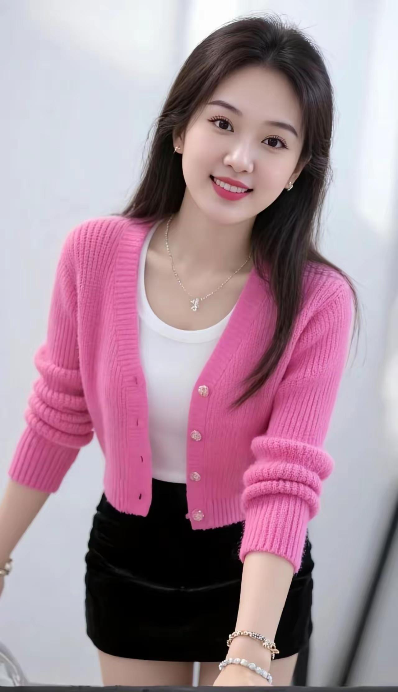 粉嫩毛衣搭配黑色短裙,甜美少女心爆棚!