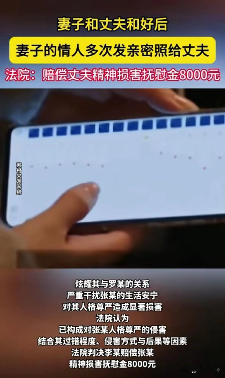 江西,女子出轨后幡然醒悟,和情人提出分手,恢复了正常的夫妻感情。不料,情人却不乐意,多次给女子丈夫发送他们的亲密合照,还发送一些侮辱、挑衅的信息,试图挑拨离间女子和丈夫的感情。女子丈夫以干扰正常生活、损害人格尊严为由,把情人告上法庭,索要精神损害赔偿,法院判了!网友:这男人真能忍,这样的女人还敢要吗? 女子罗某原本有着安稳的家庭生活,可结婚不久,她就厌倦了婚姻的平淡,想逾越婚姻的枷锁,尝一尝婚外的新鲜。 罗某最终没能守住婚姻的底线,背着丈夫,悄悄和男子李某发展成不正当的男女关系。 这段违背道德的感情,让罗某内心一直备受煎熬,她清楚自己的行为伤害了丈夫张某,也破坏了原本和睦的家庭。 这段感情没多久,罗某满心愧疚,下定决心和李某断绝关系,回归自己的家庭。 做出决定后,罗某主动找到李某,明确提出了分手,表明自己要好好和丈夫过日子,再也不会和他有任何牵扯。 回到家中,罗某坦诚面对自己的错误,用心弥补对丈夫张某的亏欠,努力修复夫妻之间的感情。 丈夫张某看着妻子真心悔改的态度,选择放下过往的芥蒂,接纳了回归家庭的罗某,两人的生活慢慢回到正轨,日子也逐渐恢复了往日的平静。 可让罗某和张某没想到的是,这段本应彻底结束的婚外情,却因为李某的不甘心,掀起了新的风波。 李某在得知罗某铁了心要回归家庭后,非但没有尊重罗某的选择,反而心生怨恨,觉得自己被抛弃、丢了面子,内心充满了不满和报复的念头。 为了破坏罗某和张某好不容易修复好的夫妻感情,李某开始做出极端的行为。 李某多次拿起手机,给张某发送自己和罗某的亲密合照,还接连发了数十条充满挑衅、辱骂和侮辱性的信息,在信息里不断炫耀自己和罗某曾经的关系,用恶毒的言语刺激张某。 这些照片和信息,像一把把尖刀扎进张某的心里,原本平静的生活被彻底打乱。 张某每天被这些恶意信息困扰,精神高度压抑,不仅生活安宁被严重干扰,作为丈夫的人格尊严也受到了极大的伤害。 即便面对这样的羞辱,张某没有被情绪冲昏头脑做出过激行为,而是选择用法律武器维护自己的合法权益。 随后,张某以李某严重干扰自己正常生活、损害人格尊严为由,一纸诉状将李某告上了法庭,要求李某承担相应的法律责任,赔偿自己的精神损失。 《民法典》第一千零二十四条规定:民事主体享有名誉权。任何组织或者个人不得以侮辱、诽谤等方式侵害他人的名誉权。名誉是对民事主体的品德、声望、才能、信用等的社会评价。 李某明知罗某已回归家庭、明确分手,仍向张某发送亲密合照,并持续发送侮辱、挑衅、辱骂信息,以炫耀、贬损方式刻意羞辱张某,主观上具有故意,行为上属于典型的侮辱式侵害人格尊严。 该行为直接降低张某的社会评价与自我人格认同,严重破坏其生活安宁,已构成对张某名誉权与人格尊严的侵犯。 《民法典》第一千一百八十三条规定:侵害自然人人身权益造成严重精神损害的,被侵权人有权请求精神损害赔偿。 李某以私密亲密照和持续侮辱挑衅的方式,针对性攻击张某的配偶身份与人格尊严,造成严重精神痛苦、生活安宁被严重干扰。 张某作为受害人,有权主张精神损害抚慰金。 法院审理认为,李某在明知罗某已经回归家庭、明确提出分手的情况下,依旧恶意发送亲密照片和侮辱挑衅信息,构成侵权,理应承担侵权责任。 最终,综合考量李某的过错程度、侵害的方式以及造成的损害后果等因素,法院判决李某赔偿张某精神损害抚慰金8000元。 事后,不少人觉得李某的行为既不道德又违法,为了一己私欲恶意破坏他人家庭,受到法律制裁是罪有应得。 也有人对张某的选择议论纷纷,感慨张某的隐忍,同时也对罗某曾经的出轨行为表示不理解。 违背道德的感情本就不该开始,即便关系结束,也不能用恶意报复的方式伤害他人,否则终将受到法律的惩罚。