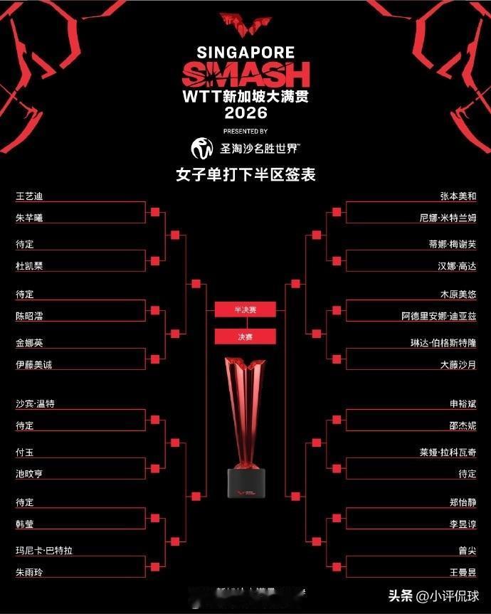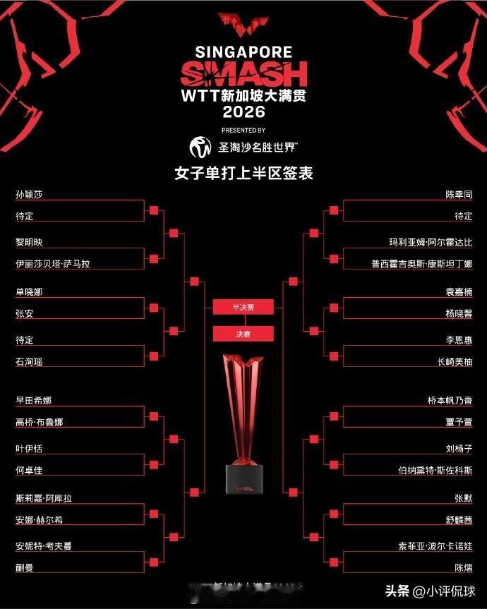 不出意外,2026年WTT新加坡大满贯女单8强99%从这8位球员中产生: 1.孙颖莎 🇨🇳 2.蒯曼 🇨🇳 3.陈幸同 🇨🇳 4.桥本帆乃香 (日本) 5.王艺迪 🇨🇳 6.朱雨玲 🇲🇴 7.张本美和 (日本) 8.王曼昱 🇨🇳 其中,孙颖莎作为卫冕冠军,世界第一,是本届新加坡大满贯夺冠大热门之一。此役,莎莎和鳗鱼各镇守上下半区,莎莎被分到1/8区,仅有石洵瑶队友,其余都是无名小卒。对于莎莎来说,晋级8强问题不大 。 反观王曼昱,镇守下半区,多以外战为主,她被分到8/8区,同区将遭遇韩国小将申裕斌挑战。不过,鳗鱼对申裕斌3战全胜,占据优势,晋级8强应该没有问题。 蒯曼,世界排名第5,国乒年轻小将。本届大满贯她被分在2/8区,同区有队友何卓佳,日本名将旱田希娜。但是,蒯曼同样实力不俗,25年拿下本站女单亚军,此役晋级8强十拿九稳。 陈幸同,世界排名第3,本战她被分到3/8区,强敌恐只有长崎美柚,只要稳扎稳打,相信陈幸同拿到一张8强席位问题不大。 桥本帆乃香,日本削球手,世界排名11,同区有国乒选手陈熠,但是从过往交锋,桥本3战胜率,陈熠处于下风。所以,桥本晋级8强可能性大一些。 王艺迪,世界排名第7,本站大满贯被分到5/8区,同区有朱芊曦和伊藤美诚强敌。王艺迪对2人胜率占优,晋级8强没有问题。 朱雨玲,世界排名第4,本届大满贯被分到6/8区,本区域没有强敌。相信朱雨玲晋级8强问题不大。 张本美和,日本名将,世界排名第6。本站她被分到7/8区,此区域并没有国乒选手,对于张本来说是上上签。可以说,张本美和晋级8强不成问题。 王曼昱,世界排名第2,本届大满贯夺冠大热门。她被分到8/8区,同区有劲敌申裕斌。不过,对于25年外战全胜的鳗鱼来说,申裕斌也不能对于王曼昱构成威胁。可以肯定的是,王曼昱拿到一张8强席位十拿九稳。 综上所述,WTT新加坡站大满贯女单8强99%从这8位球员中产生。对此,你是怎么看呢?欢迎留言到评论区,感谢你的分享和点评。 新加坡大满贯 国乒 乒乓球 孙颖莎 王曼昱 张本美和 蒯曼 王艺迪 陈幸同 桥本帆乃香