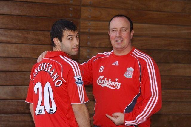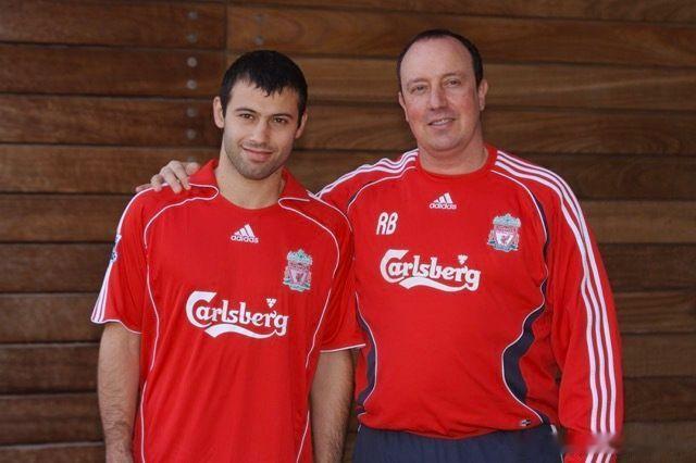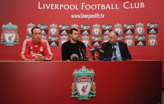2007年2月马斯切拉诺租借加盟利物浦,与贝尼特斯合影和新闻发布会现场。有人说,2月转会时不时有点奇怪