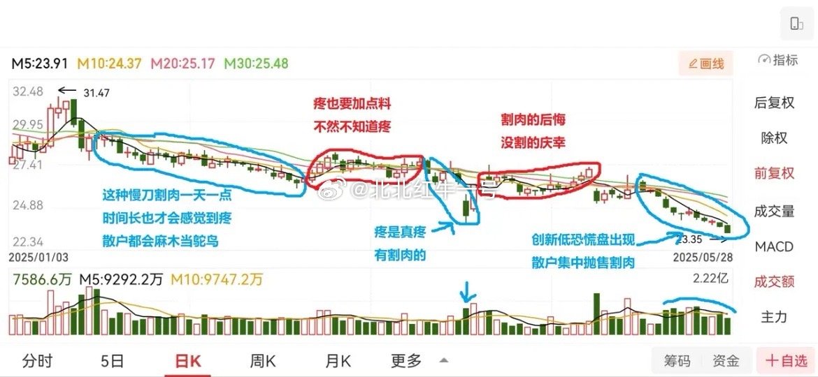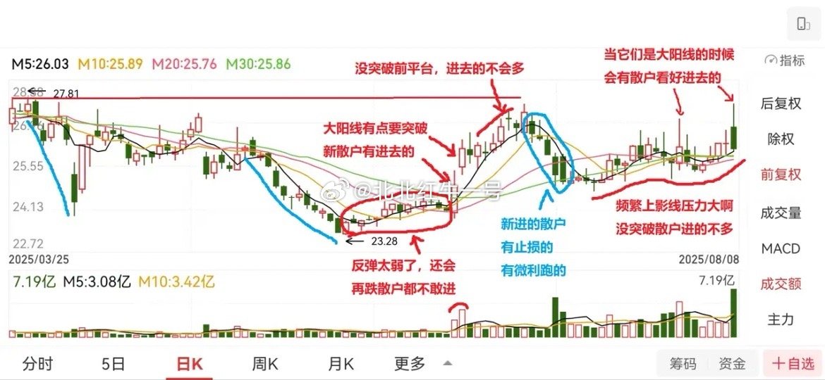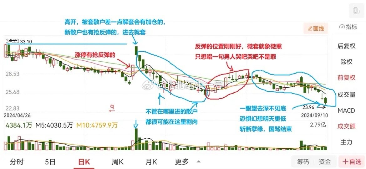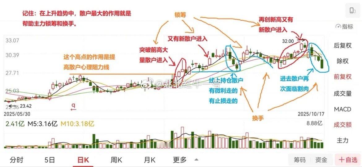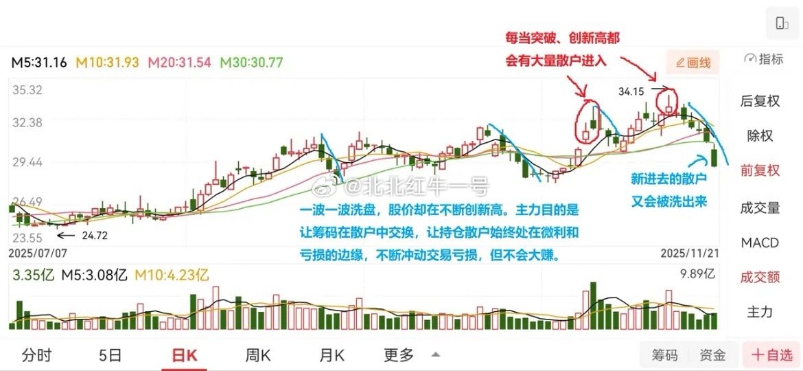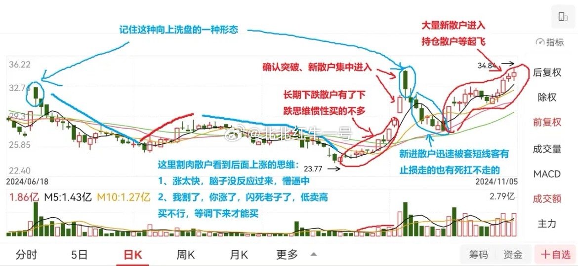 散户思维训练(十二)散户一定要坚持用历史K线做自我训练!利弗莫尔说:“投机像山岳一样古老,因为人性在股市里从未改变”。大众散户的集体心态和操作习惯,最终都会成为市场反复收割的弱点。谁真正读懂了散户群体思维,谁就掌握了股市的财富密码。 主力要出货,一定得有散户进场接盘;少量散户进场,主力就立马洗盘这是符合逻辑的;大量散户扎堆进场,主力就狠狠地洗盘,这也是符合逻辑的。等把大部分散户洗出去,下一波拉升就来了,再吸引新一批散户进场,实现筹码换手。有经验的散户会发现一个现象:股价一路洗盘、一路震荡,却越洗越高,不断创新高,而散户却始终挣不到钱,背后就是这个逻辑。