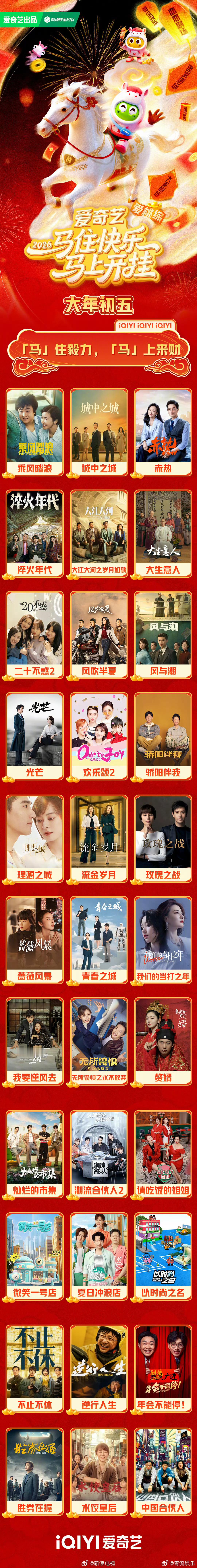 桃厂马住快乐马上开挂 大年初五「马」上迎财神,更要「马」住好片!桃厂马上来财片单 已就位,《乘风踏浪》《大江大河之岁月如歌》《风吹半夏》《我要逆风去》等精彩好片陪你开启幸运2026,快来pick你的“新春宅家好搭子”吧!