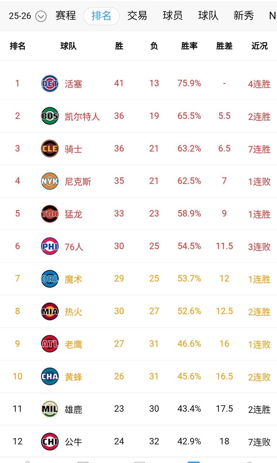 东部变天了!曾经28连败的烂队如今跃居联盟榜首。 哈登的到来让骑士发生质变。骑士近13战12胜,今日击败黄蜂迎来7连胜,战绩来到36胜21负,排名超越尼克斯升至东部第3! 热火击败老鹰,距离东部第六又近了一步,只差一个胜场差。 黄蜂2连败,逐渐被雄鹿赶上来了。