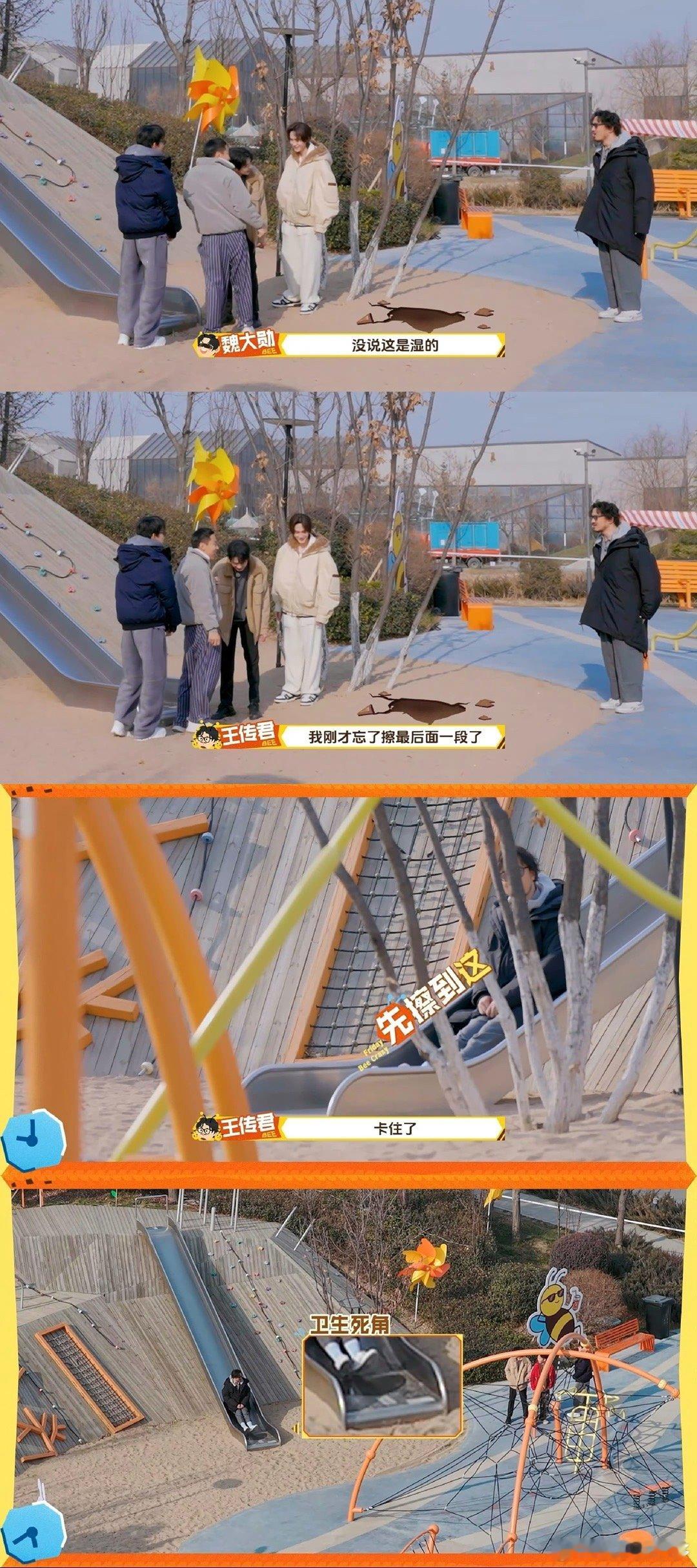 魏大勋屁股凉凉的 王传君擦滑梯漏了最后一截,积水等着“招待”魏大勋!一滑下去直接湿身,这波猝不及防的清凉太绝~
