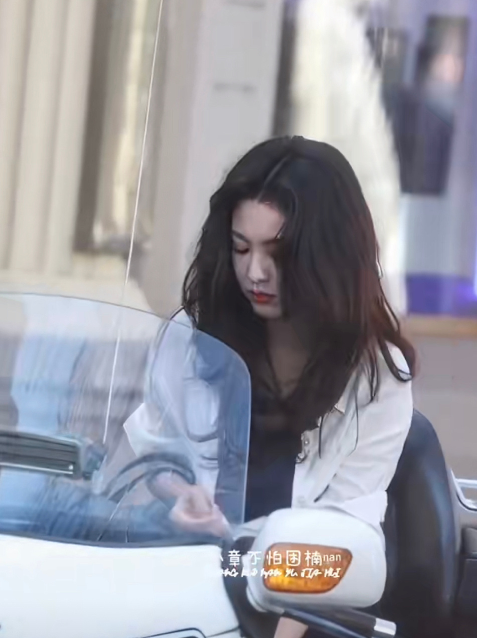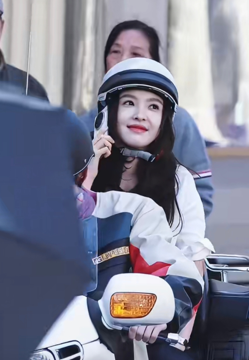 章若楠戴头盔路透,千盏姐姐穿这么美骑小电动车带头盔
