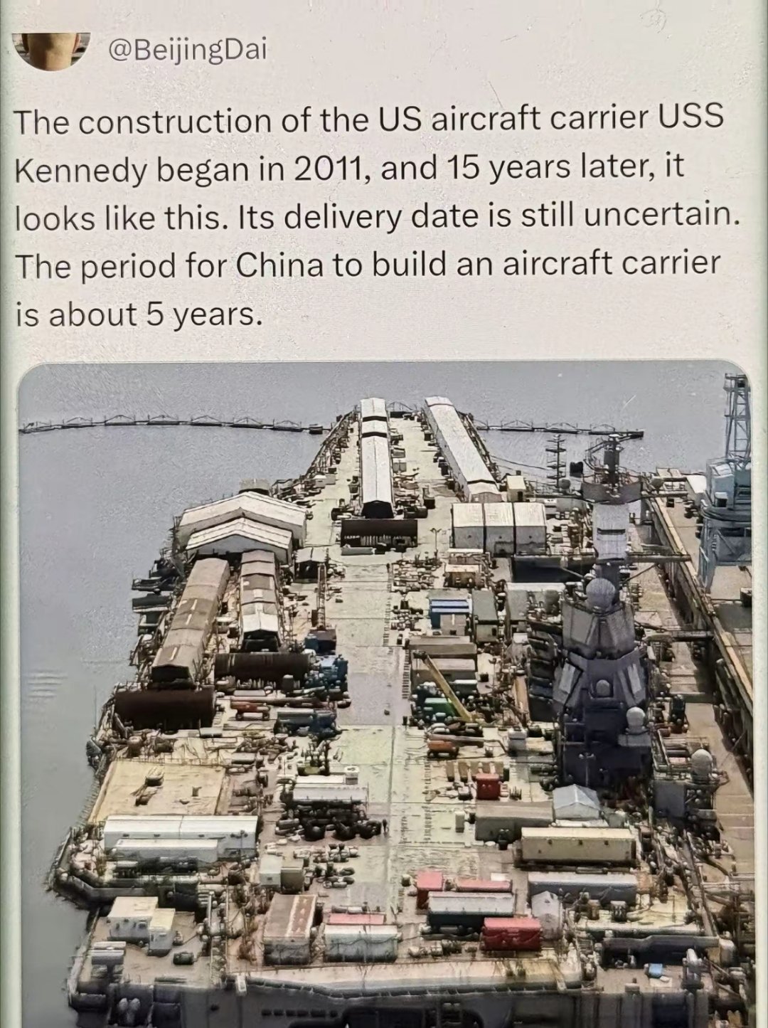 美国肯尼迪号航空母舰于2011年开始建造,15年后,它看起来是这样的。其交付日期仍不确定