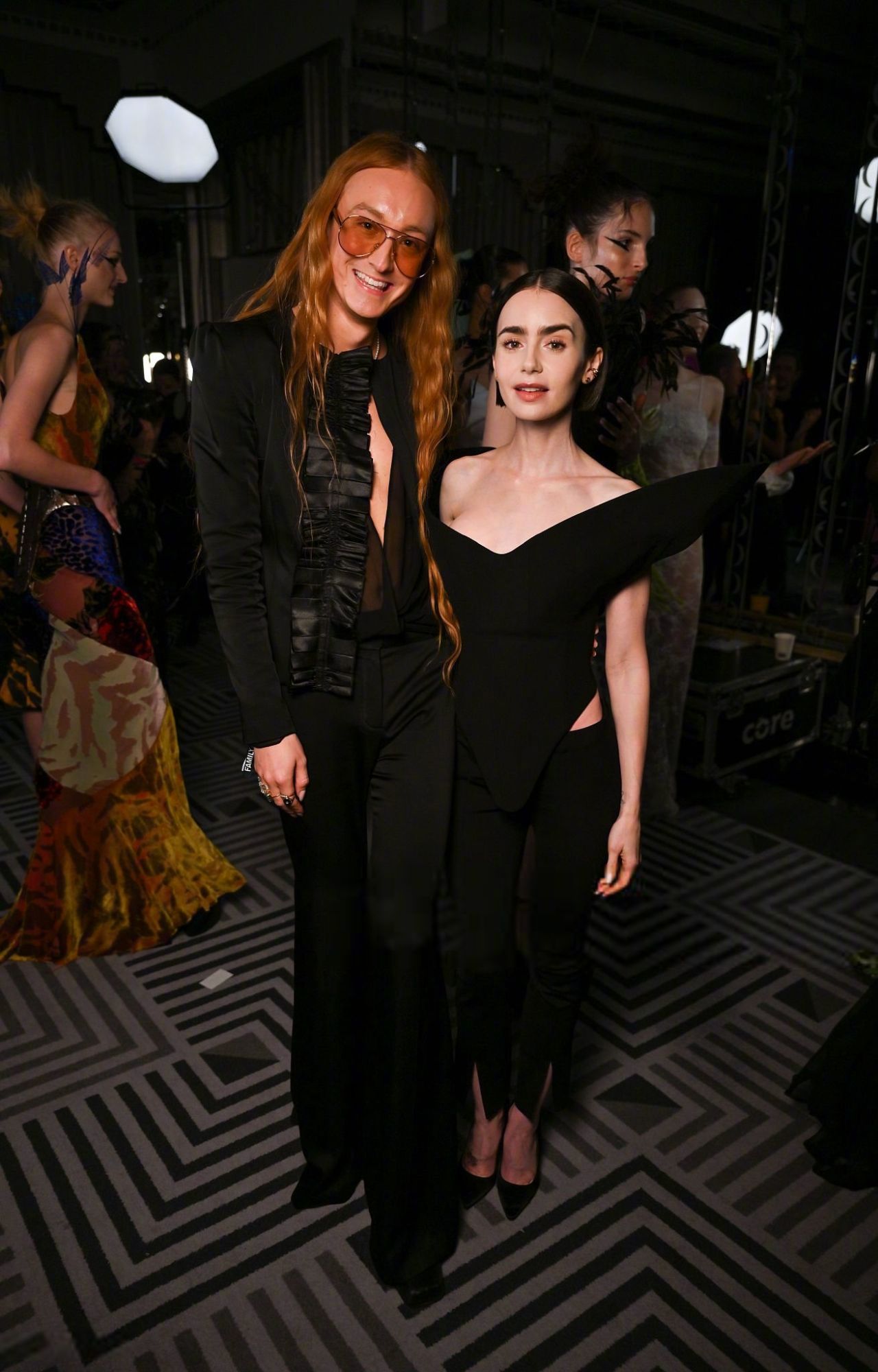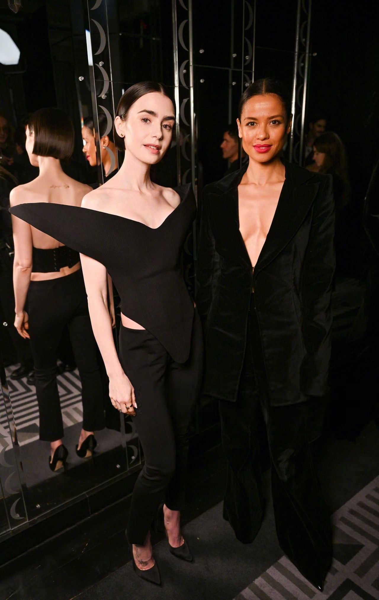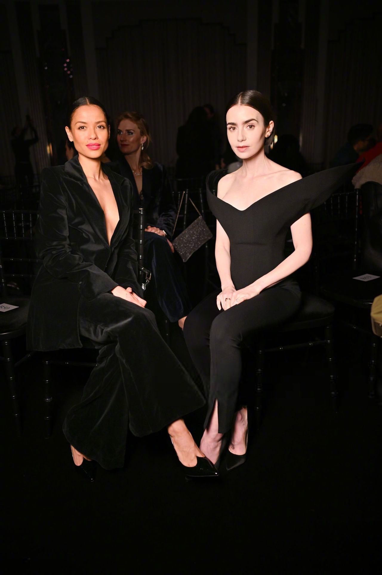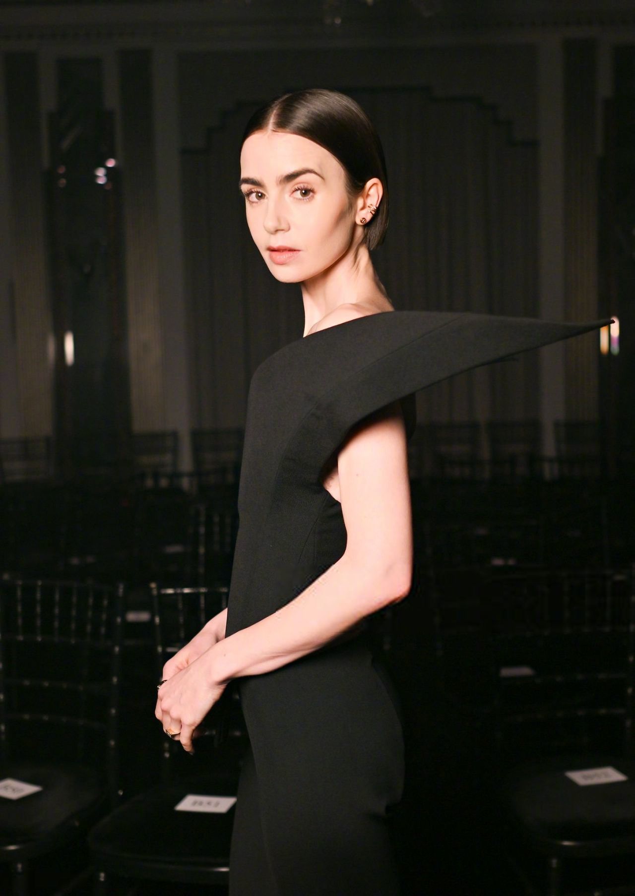 出席Harris Reed 2026 秋冬系列发布秀的莉莉·柯林斯,身穿了一件黑色雕塑感无肩带上衣,两侧夸张地呈翅膀状展开,下穿了一条修身的黑色直筒裤 ,裤脚前侧开衩,简洁利落,佩戴尖头高跟鞋。这身雕塑感服装与她的五官很相配,也很漂亮。时装周伦敦时装周米拉服饰解析
