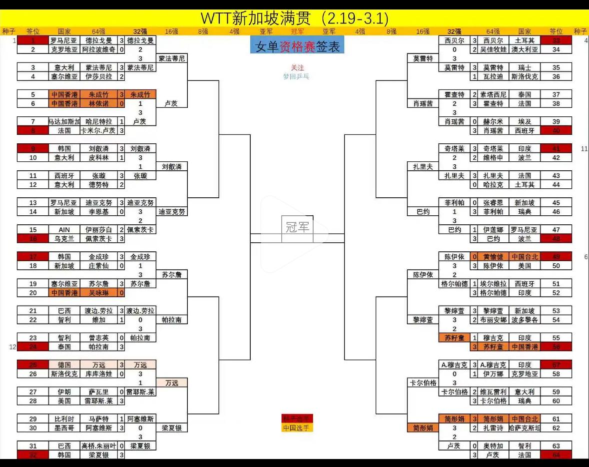 新加坡大满贯资格赛男女单打16强出炉 新加坡大满贯资格赛经过 两天半的激烈角逐, 男女单打16强选手出炉, 今天晚上将决出男女 各8名选手晋级正赛! 正赛预留男女各8个席位是 资格赛选手! 女单简彤娟,万远,卢茨, 帕拉南等,最后也是排名 靠前的选手晋级正赛! 男单资格赛选手门科, 张佑安,奇里塔,罗伯勒斯等 都有晋级正赛的机会!