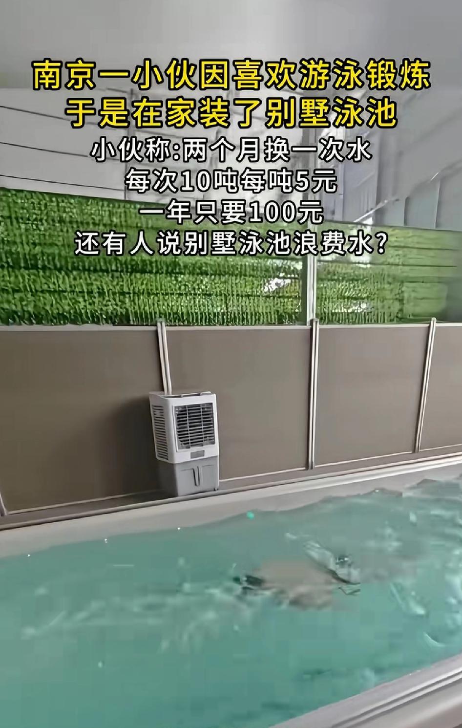 南京一小伙因喜欢游泳锻炼,于是在家装了别墅泳池。 小伙称:两个月换一次水,每次10吨每吨水5元,还有人说游泳池浪费水? 有钱又喜欢游泳的人,在家装个游泳池真的很实用。去游泳馆游泳首先里面的水是否干净卫生?游泳池离家再近也不如家里有自己的私人游泳池方便。 不得不说小伙很懂的享受生活,拿钱取悦自己,这也是挣钱的意义,不做守财奴。 这换水频率和常规有点不同啊。一般住宅私人泳池建议2 - 3年换一次水,入冬前也得换。 小型家庭泳池一般1 - 2周换一次,大型的2 - 3个月换。小伙俩月一换,可能他泳池使用频率高,水里细菌、污染物积累快。也可能他对水质要求高,不想让水有啥杂质。 不过换水成本也不低,水费、加热费、化学药剂费都得考虑。只能说,为了热爱的游泳,这小伙也是够拼的!