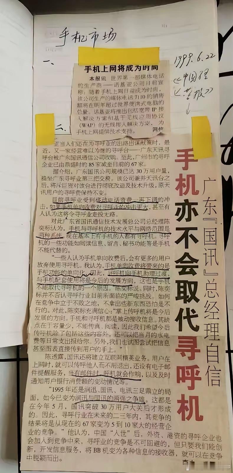 九十年代末传呼的经营商的报纸宣传:手机亦不会取代寻呼机。