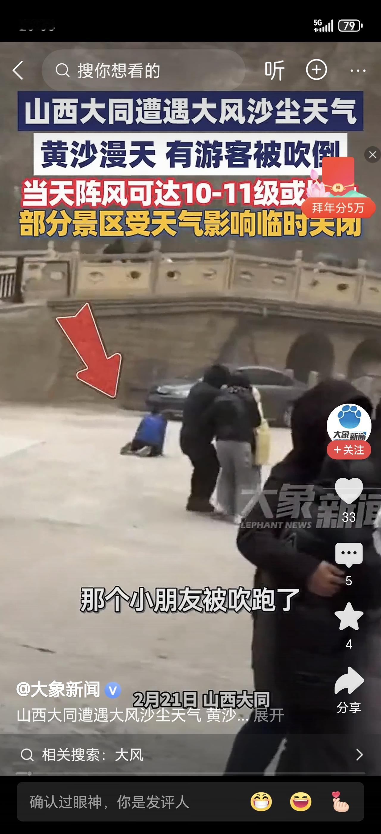 大同游客直接被吹倒!沙子打脸上像刀割,人站都站不稳……现场画面太震撼了! 2月21日,山西大同遭遇极端沙尘天气。有游客刚到恒山景区门口,还没来得及拍照,一阵狂风裹着黄沙扑面而来,人直接一个踉跄——被吹倒了! 旁边的人赶紧去扶,自己也差点站不稳。视频里能听到有人喊:“我的天,这风要把人吹跑了!”漫天的黄沙遮天蔽日,能见度骤降,整个恒山山门都被沙尘吞没。 不止一个人被吹倒。多名游客反映,当时风力大得离谱,“石子打在脸上都有刺痛感,根本走不动道”。有人形容:“就像站在沙漠风暴里,眼睛睁不开,呼吸都困难。” 更夸张的是,景区紧急发布通告——恒山、悬空寺全部临时闭园,停止售票,游客被大巴紧急疏散。原定的大同古城花车巡游、古都灯会也全部取消。 气象台的数据让人倒吸一口凉气:大同全市平均风力6-8级,阵风高达10-11级!这是什么概念?10级风能拔树毁屋,人在户外根本站不住。 有网友调侃:“这哪是旅游,这是去参加‘荒野求生’现场版。”也有人后怕:“幸好景区反应快,不然后果不堪设想。” 如果你在景区突遇这种极端天气,第一反应是找地方躲还是往外跑?你经历过最吓人的恶劣天气是什么样的?评论区聊聊!恒山风光 大同景点测评 恒山奇观 恒山旅游