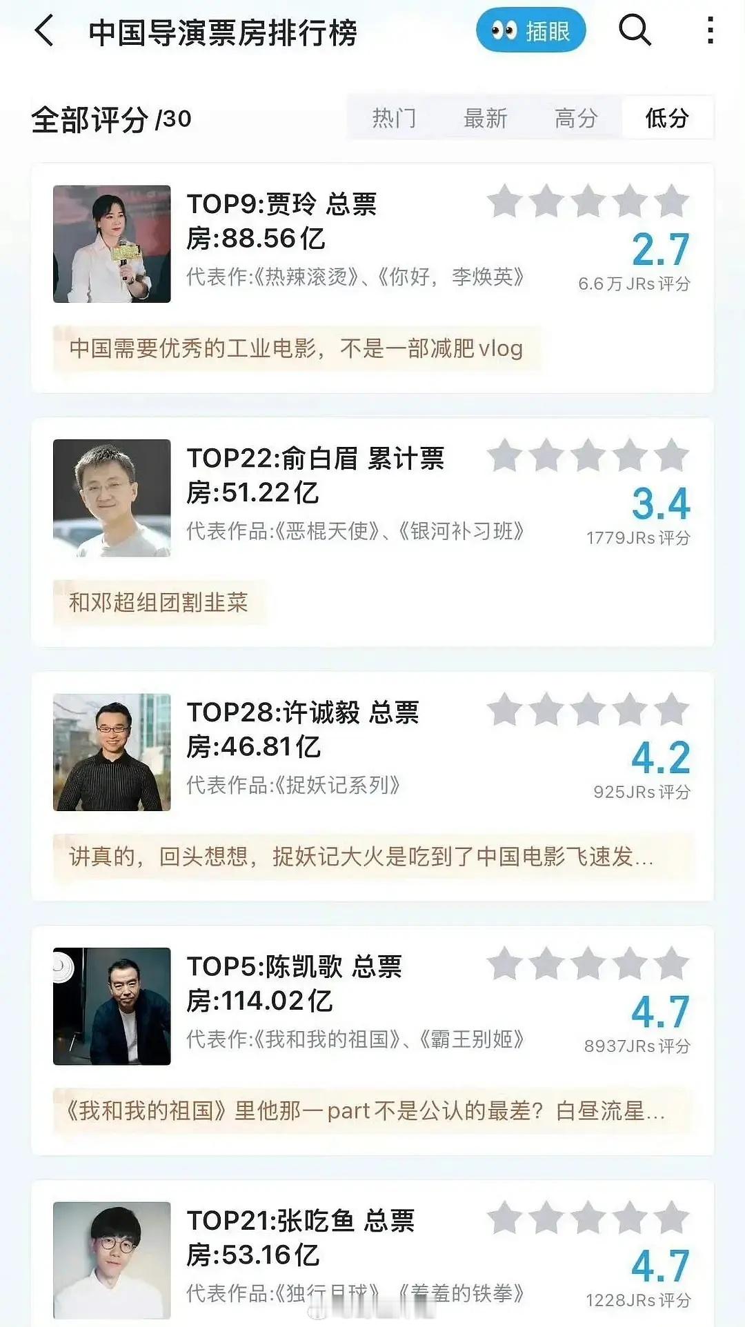 虎扑给所有导演打分,6.6万人给贾玲打出了2.7分,全场最低。。。