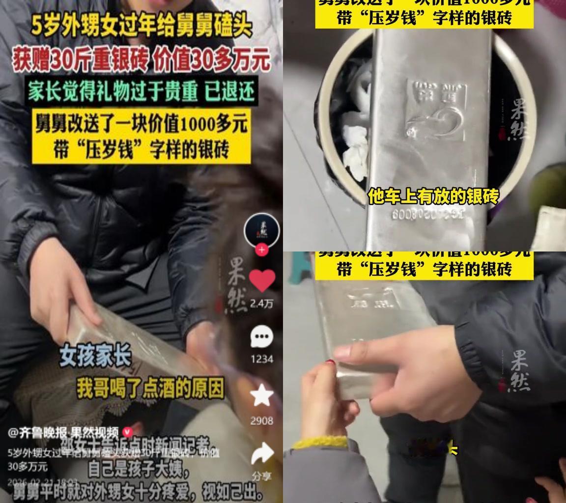 外甥女磕头,舅舅送30斤银砖! 5岁外甥女春节给舅舅磕头拜年,舅舅直接掏出30斤重的银砖当压岁钱。 别说是噱头,按今天的白银价算,15kg银砖实际能卖26-28万,体积也完全符合物理常识,实打实的硬通货! 现在过年发红包,谁不是先在心里扒拉着算回礼金额? 好好的亲情,早变成了份子钱等价交换的游戏。 转个账秒到账,数字飘在屏幕上,半分温度都没。 可这舅舅倒好,不管那些虚头巴脑的规矩。 把对孩子的疼惜,直接做成了能摸得到重量的银砖。 这哪是压岁钱啊,是把偏爱明明白白砸在了你面前! 比起那些算来算去的人情账,这种直白又沉甸甸的宠爱,才真的让人暖到心里去了。 谁看了不说一句,这舅舅,简直是宠娃界天花板!