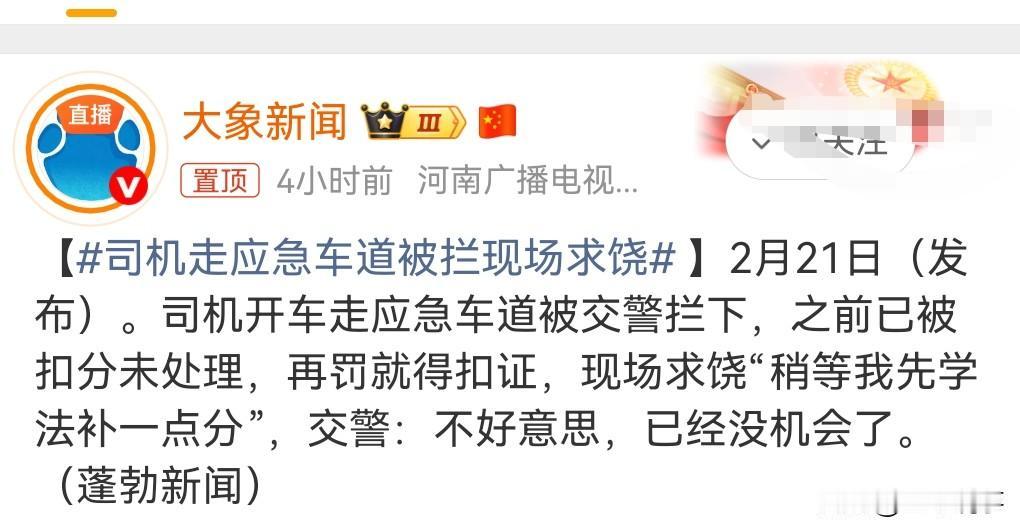 遵守交通规则,实在是太重要了。侥幸心理不要太强了,不要看到别人走应急车道就跟着学,被交警抓到了后果很严重的。 2月21日(发布日期),司机走应急车道被拦,现场求饶。 被抓到了,知道后悔了,但是交警说没机会了。 这必须好好处理这个司机。 这都是自己咎由自取。