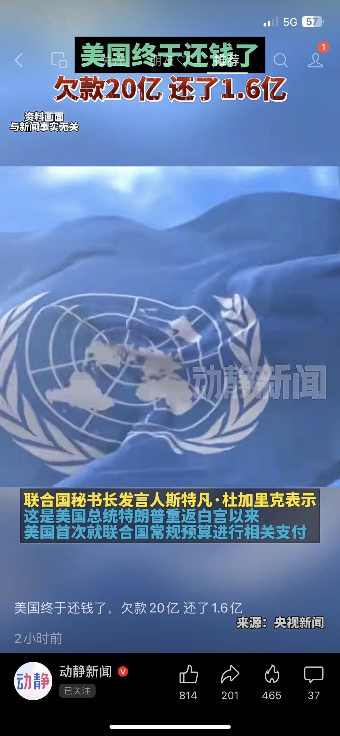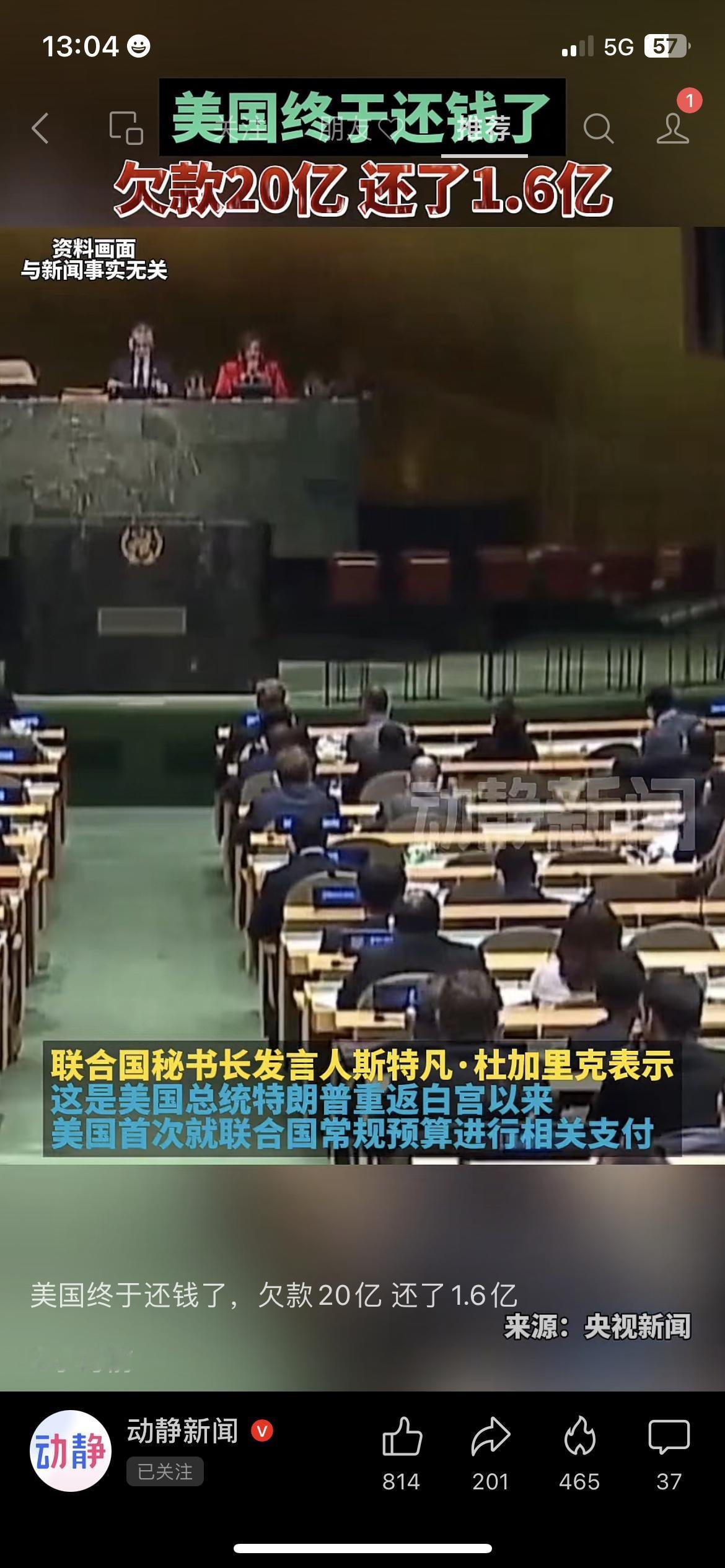 美国欠联合国20亿美元,这次只还了1.6亿。 连零头都算不上,更像是象征性走个过场。 很多事别看表面,看行动、看结果、看长期信用。 对我们普通人也一样: 说什么不重要,做什么才重要。 你觉得这种行为能提升公信力吗? 美国联合国会费 大国信用 国际新闻