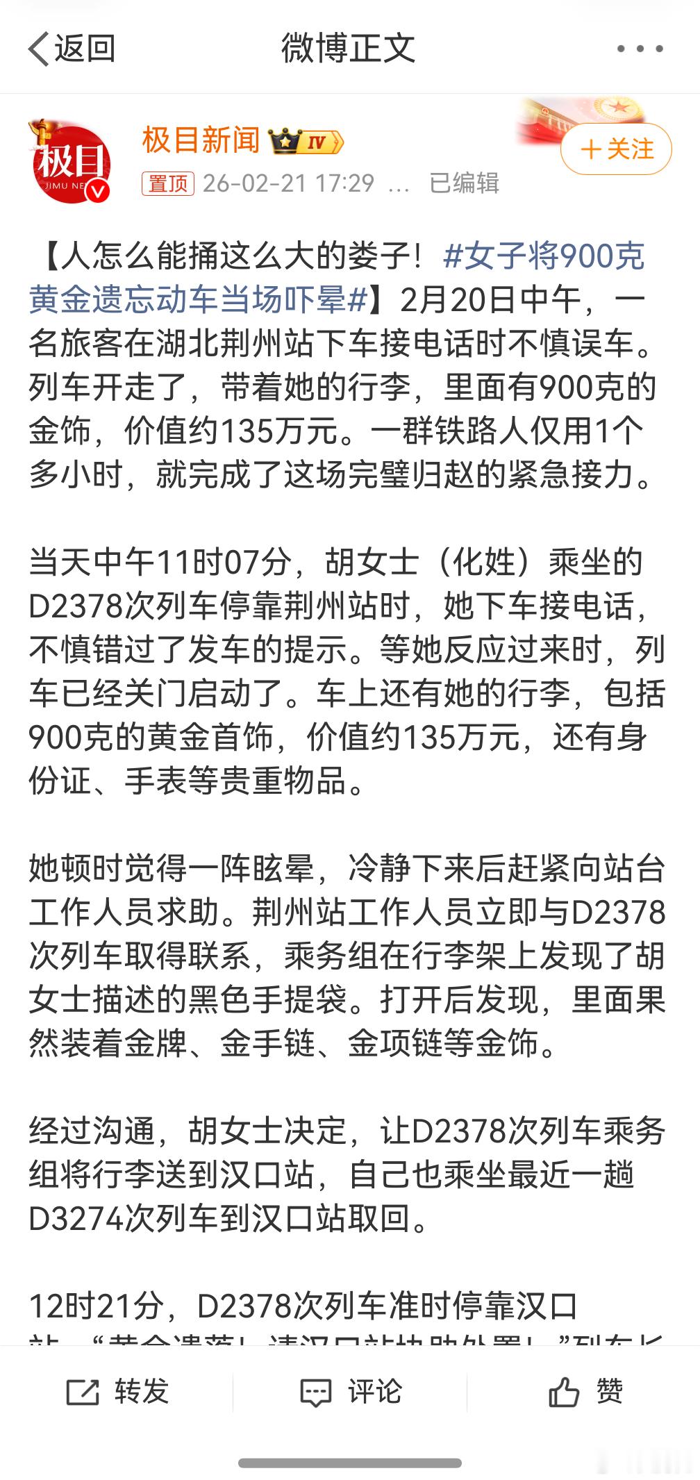 女子将900克黄金遗忘动车当场吓晕,还是太有钱了,或者跟个人性格有关系,我这种人如果要干一个很重要的事,我今天的精神头会全部聚焦在这件事上,干啥都不可能把这个事给忘了的。