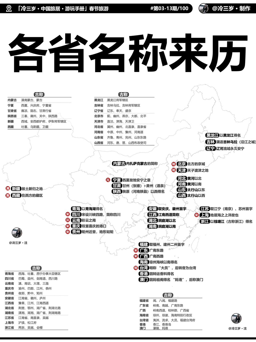 最近我在规划今年旅居生活 看先去哪些省份 自驾路线如何 所以在着手开始研究 各省的山河地理,人文历史等情况了 出于好奇,我也看了下各省份为啥叫这个名字 还挺有意思的 也分享出来 包括名称由来,及曾用名/古称等 Ps1.其实不少古称还挺好听的,如长安等 Ps.祖籍江西,一直好奇 别人都是组队 山东山西,河南河北 北京南京,广东广西 为啥只有江西,没有江东