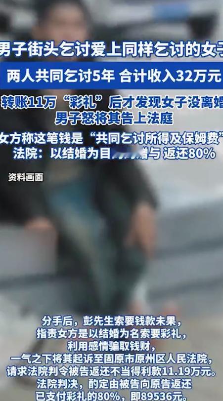 “比电视剧还狗血!”宁夏,一离异男子街头乞讨,爱上同样乞讨的女子,女子说她也离婚了,2人同居并联手乞讨5年,讨了32万,女子要20万彩礼,男子给女子11.19万彩礼,想娶她为妻,给完才发现她是有夫之妇,男子被耍了,可把他气炸了,直接把女子告上法庭,要求退回11.19万,女子却一口咬定:11.19万是共同乞讨所得及保姆费。法院判决出乎意料。 张某把那条洗得发白的围巾在脖子上绕了两圈,照常出门。她没有去和彭某约好的那个路口,而是拐进了更偏僻的一条小巷。她心里清楚,今天要见的人,不能让彭某看到。 那名男子,比她大几岁,是她法律意义上的丈夫。 两人并没有并肩走着,而是一前一后,隔着七八步的距离。张某走在前面,脚步很快,像是在逃。男子在后面低声叫了她一声,她却没回头,只是肩膀轻轻抖了一下。 他们在一家小饭馆门口停下。门脸很小,油烟味浓得呛人。张某终于转过身,语气压得极低:“不是说了,别来找我吗?” 男子皱着眉,声音里带着火气:“你在外面都干了什么?有人跟我说,你跟别的男人住一块儿,五六年了。” 张某的脸一下子白了。她下意识左右看了一眼,生怕被熟人看见。她没否认,只是咬着牙说:“那是过日子,我也没花你的钱。” “可你还是我老婆。”男子一句话,像一块石头砸下来。 张某的手指在衣角上反复搓着。她心里很清楚,这段婚姻从来就没真正结束过。没有离婚证,没有分割干净的关系,只是各自烂在生活里。 她骗彭某说自己离过婚,其实从一开始就是抱着侥幸——街头讨生活的人,谁会去查这些? 可她没想到,这一天来得这么突然。 更没想到的是,这一幕,被彭某看见了。 彭某原本是来找她的。他在街口等了很久,没见人,心里发慌,顺着她常走的路找过来。远远地,他就看见张某站在饭馆门口,身边站着一个陌生男人。那男人的手,几乎要碰到她的胳膊。 那一刻,彭某脑子“嗡”的一声。 他没听见他们说什么,只看到张某低着头,像以前对自己那样,一副认命又委屈的样子。可那姿态,却是给另一个男人的。 彭某冲过去的时候,张某先看见了他。 那一瞬间,她心里所有的预案全乱了。她张了张嘴,却一句话都说不出来。彭某的脸涨得通红,眼睛里全是血丝,像一头被逼到角落的野兽。 “他是谁?”彭某吼出来,声音劈了。 男子愣了一下,随即下意识挺直了腰:“我是她老公。” 这句话,像刀一样,直接捅进彭某心里。 张某知道,一切都完了。 彭某没有再听解释。他开始疯狂地找她,要钱,要说法。他在街头拦她,在出租屋门口等她,甚至半夜拍门。张某一开始躲,后来干脆不躲了。 她也累了。 在彭某面前,她第一次没有哭,也没有装可怜。她坐在床沿上,语气冷得像石头:“钱不是都在一起讨的吗?我伺候你五年,吃喝拉撒哪样不是我?” 彭某气得浑身发抖:“你骗我!你根本就没离婚!” 张某别过脸去。她不敢看他,但心里却有一股说不清的怨气。她骗了人,这是事实。可这五年,她也不是没付出。 寒冬腊月一起睡过桥洞,生病的时候给他端过水,讨不到钱的时候,她也跟着挨骂。 在她的逻辑里,这不是一场单纯的欺骗,而是一场各取所需的共生。 只是,她低估了彭某对“结婚”这件事的执念。 当彭某说要告她的时候,张某并不意外。她甚至有一种迟来的解脱感。她知道,自己终究要为这场谎言付出代价。 后来在法庭上,她依旧咬死那套说法:钱是共同所得,是照顾彭某的辛苦钱。 法院经审理认为,彭某与张某虽长期共同生活并以乞讨维持生计,但双方始终未依法办理结婚登记手续,不构成合法婚姻关系。 彭某向张某给付的11.19万元,系基于双方即将结婚的意思表示而支付,具有明确的结婚目的,依法应认定为以缔结婚姻为前提的赠与行为。 现因张某隐瞒其尚处婚姻关系中的事实,导致双方结婚目的无法实现,赠与基础已经丧失。根据公平原则及相关司法解释,张某应当返还彭某已收取的彩礼款项。 综合考虑双方共同生活时间、经济来源及实际消耗情况,法院酌情判令张某返还彩礼款项的80%,即人民币8.95万元,其余部分不再支持。