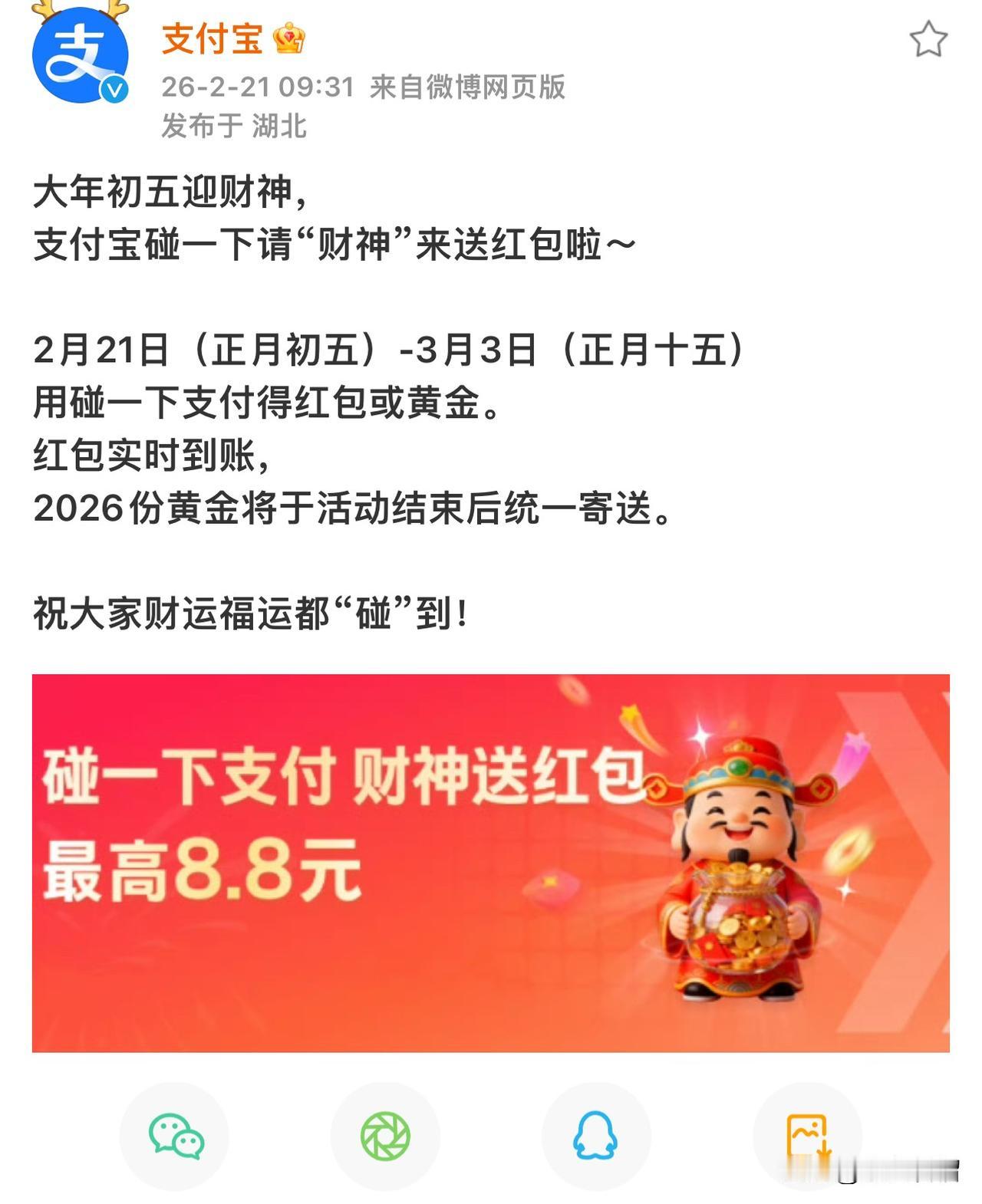 从大年初五开始, 支付宝“碰一下”支付给咱送红包了, 支付宝真的是一个“活财神”呢, 反正过年总要消费的, 能减一点是一点, 运气好的还能得黄金, 大家会选择“支付宝”进行消费吗? 你们觉得碰一下软件消费安全吗? 愿大家都能“碰”出好运,碰出开心! 走,明天就去试试运气去! (图片来源网络)