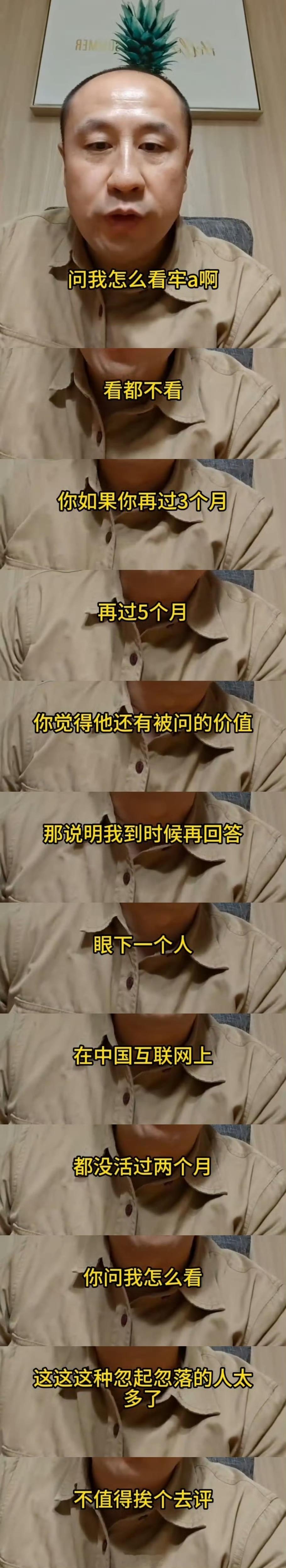 “问我怎么看牢A啊?看都不看。你如果再过3个月,再过5个月,你觉得他还有被问的价值,那说明我到时候再回答。眼下一个人,在中国互联网上,都没活过两个月,你问我怎么看?这种忽起忽落的人太多了,不值得挨个去评。”