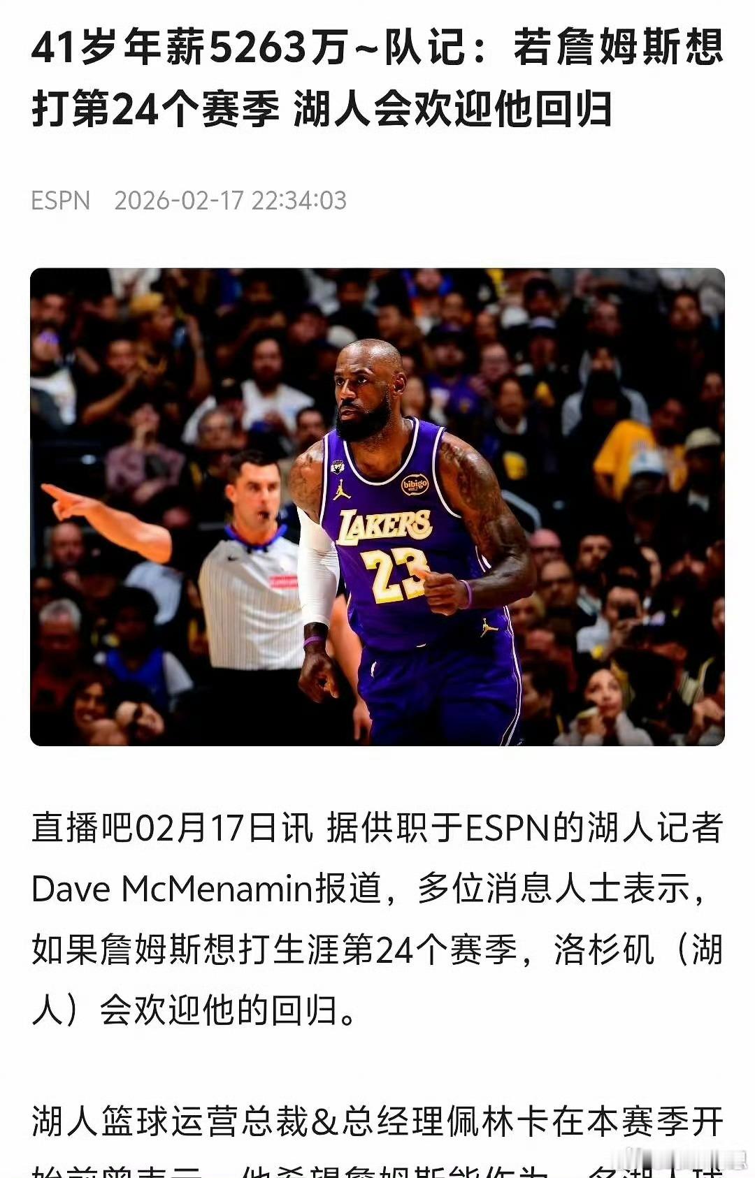41岁的詹姆斯,还想拿5000万?湖人总经理一句话,把天聊死了。佩林卡当着所有记者的面,话撂得很明白:洛杉矶,就是勒布朗的家,想打到哪天都行。但那个5字头的合同,你别想了。球队的5100万空间,要砸在东契奇身边,这是规矩。说他老了?你看看数据单:场均33分钟,硬生生凿下22分7助攻,命中率过五成。球队的正负值,他一个人扛着跑。这哪是商业价值,这是拖着球队往前爬。所以你得明白,对一个传奇来说,最后一站的选择,从来不是为了叶落归根的童话,而是为了铸就王朝的最终一战。nba湖人詹姆斯