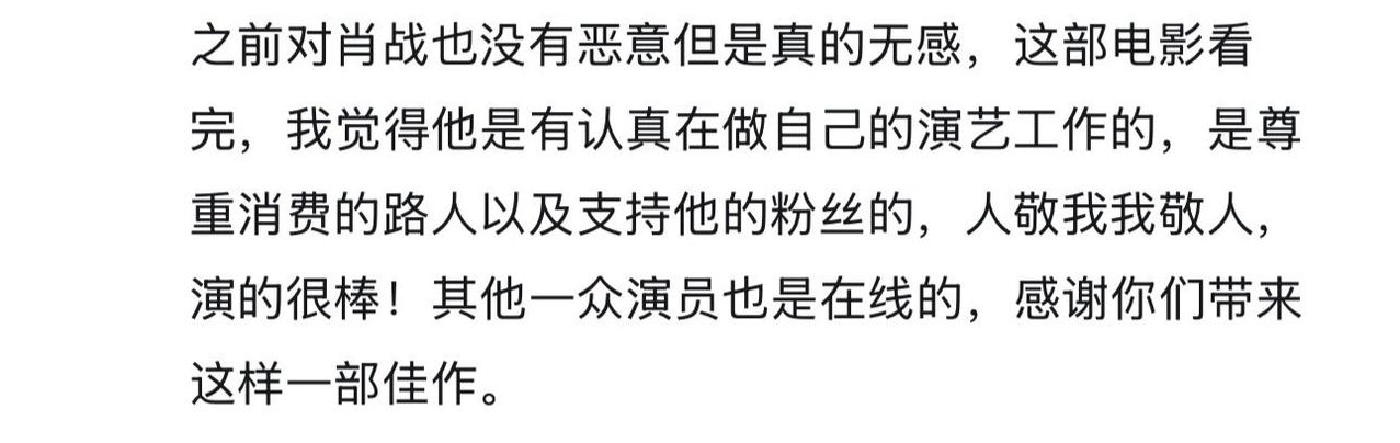 看截图就知道肖战才是这个电影春节档的大赢家[捂脸]。关键是人家还没有电影在这个档期里上映。 这几天他那部曾经在冷档期空降的电影《得闲谨制》全平台上线了,影片口碑再度发酵,各个平台路人好评不断,连曾经跟风黑过他的也不得不承认他演技厉害。 其实肖战在《陈情令》的时候演技就很好了,只是某些人为黑而黑而已,有不少人都吃过洗脑包。 我觉得肖战演技绝对能称得上精湛,他演过那么多的角色,我就没有在哪一个角色上看到有其它角色的影子,细节表情都有所区别,太厉害了。你们觉得呢?