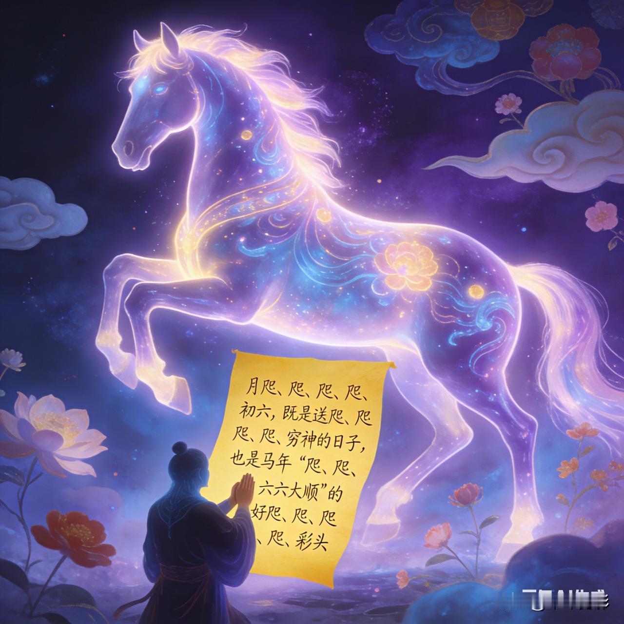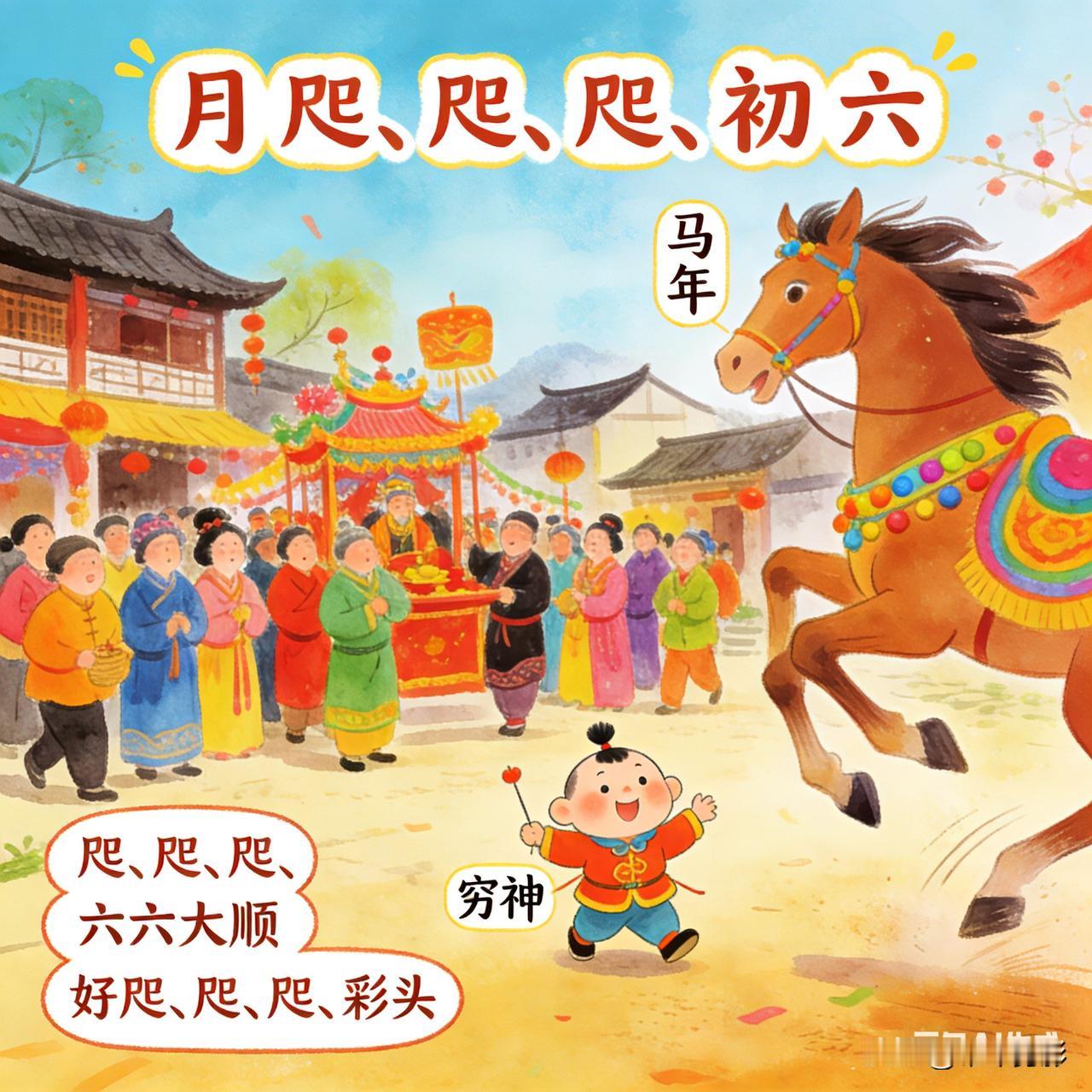 正月初六·马年送穷迎顺 灵蛇辞岁去,金马踏春来。 初六送穷神,家家扫尘埃。 鞭炮驱旧晦,笑语迎新财。 六六大顺意,策马奔鸿途。