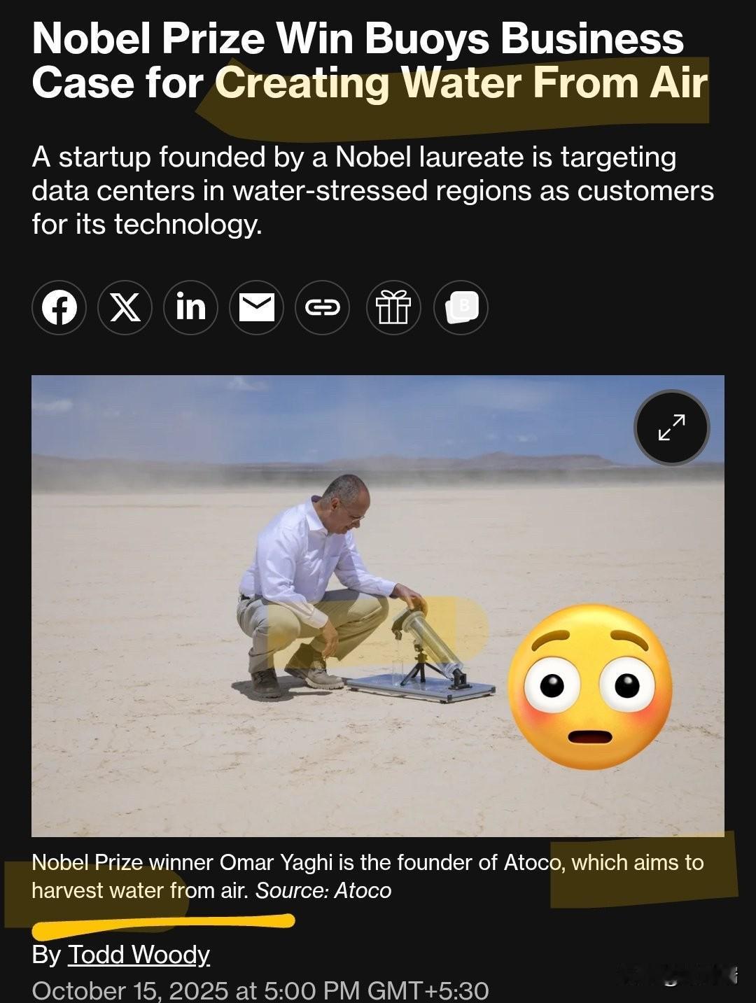 奥马尔·亚吉 (Omar Yaghi) 因开发金属有机框架 (MOFs) 的贡献,与理查德·罗布森 (Richard Robson) 和北川进 (Susumu Kitagawa) 共同荣获 2025 年诺贝尔化学奖。 这项技术被誉为“分子海绵”,通过他开创的网状化学 (Reticular Chemistry) 理论,科学家可以像拼乐高一样精确设计材料结构。 1. 核心发明:从空气中“炼”水 这套制水机器是由亚吉教授创立的初创公司 Atoco (位于加州尔湾) 商业化的。 高效产能: 这种机器(尺寸约为 20 英尺标准集装箱)在理想条件下每天最高可提取 1000 升 洁净饮用水。 极端环境适用: 它是全球首个能在沙漠极端干旱(湿度低至 10%-20%)环境下高效运行的系统。 零电力驱动: 该设备完全利用环境热量(如阳光或废热)驱动,无需外接电力或电池,非常适合偏远和受灾地区。 2. 网状化学的魔力 亚吉教授通过将金属离子与有机分子连接,制造出拥有超高表面积的晶体材料: 惊人的表面积: 仅仅 1 克 MOF 材料的内部孔隙展开后,其面积可覆盖数个足球场。 精准捕捉: 他设计的 MOF-303 等材料能像磁铁一样只吸引空气中的水分子,并在受热时将其释放成液态水。 3. 多领域的应用前景 除了解决水危机,他的这项诺奖级技术还在以下领域具有巨大潜力: 碳捕集: 直接从大气或工厂排放中捕捉二氧化碳,缓解气候变化。 能源存储: 用于高密度存储氢气或甲烷,助力下一代清洁能源汽车。 医疗与环保: 过滤水中的 PFAS(永久性化学物质)或制药废水中的残留物。 目前,Atoco 公司计划在 2026 年底 开始接受这种集装箱式制水单元的订单。