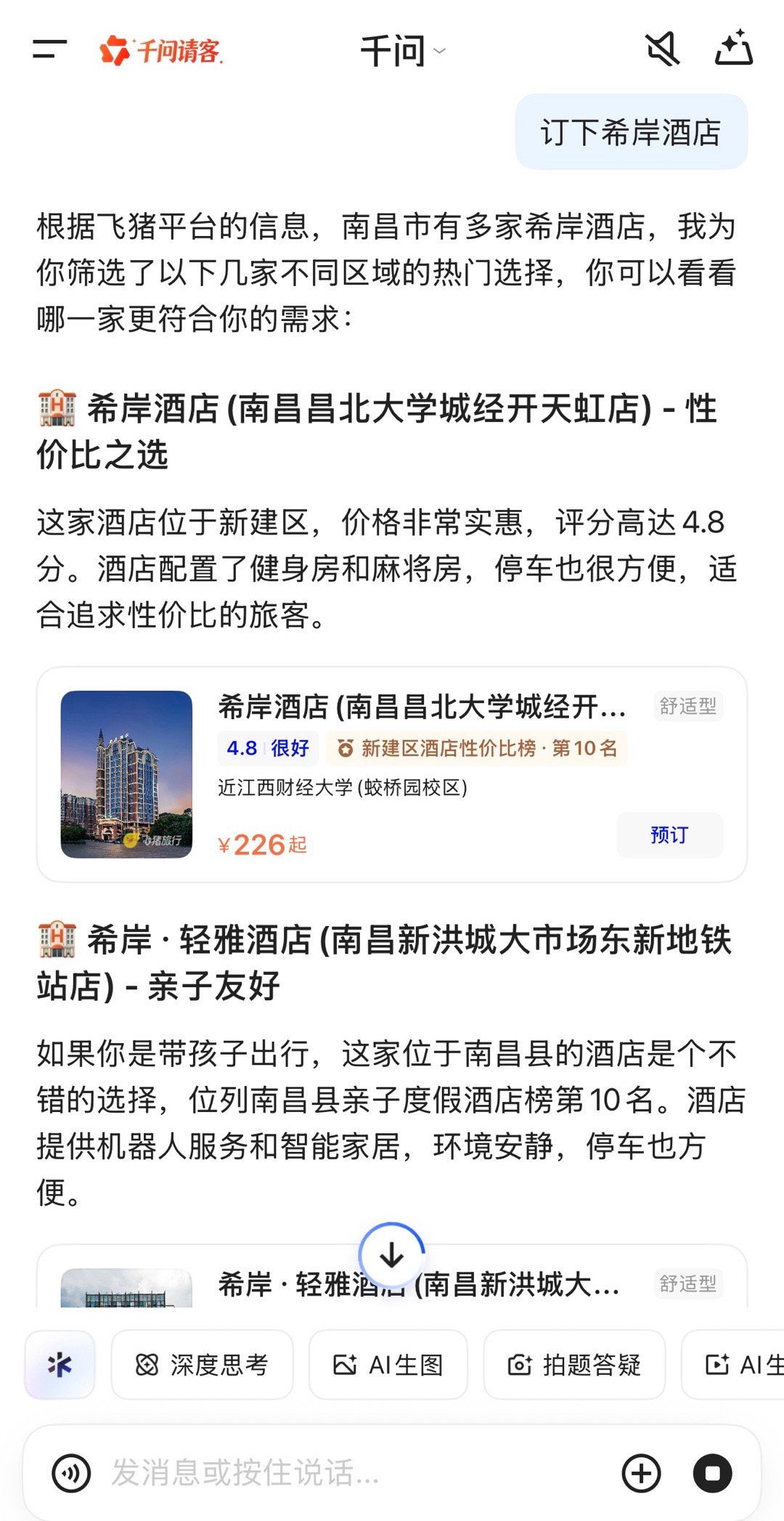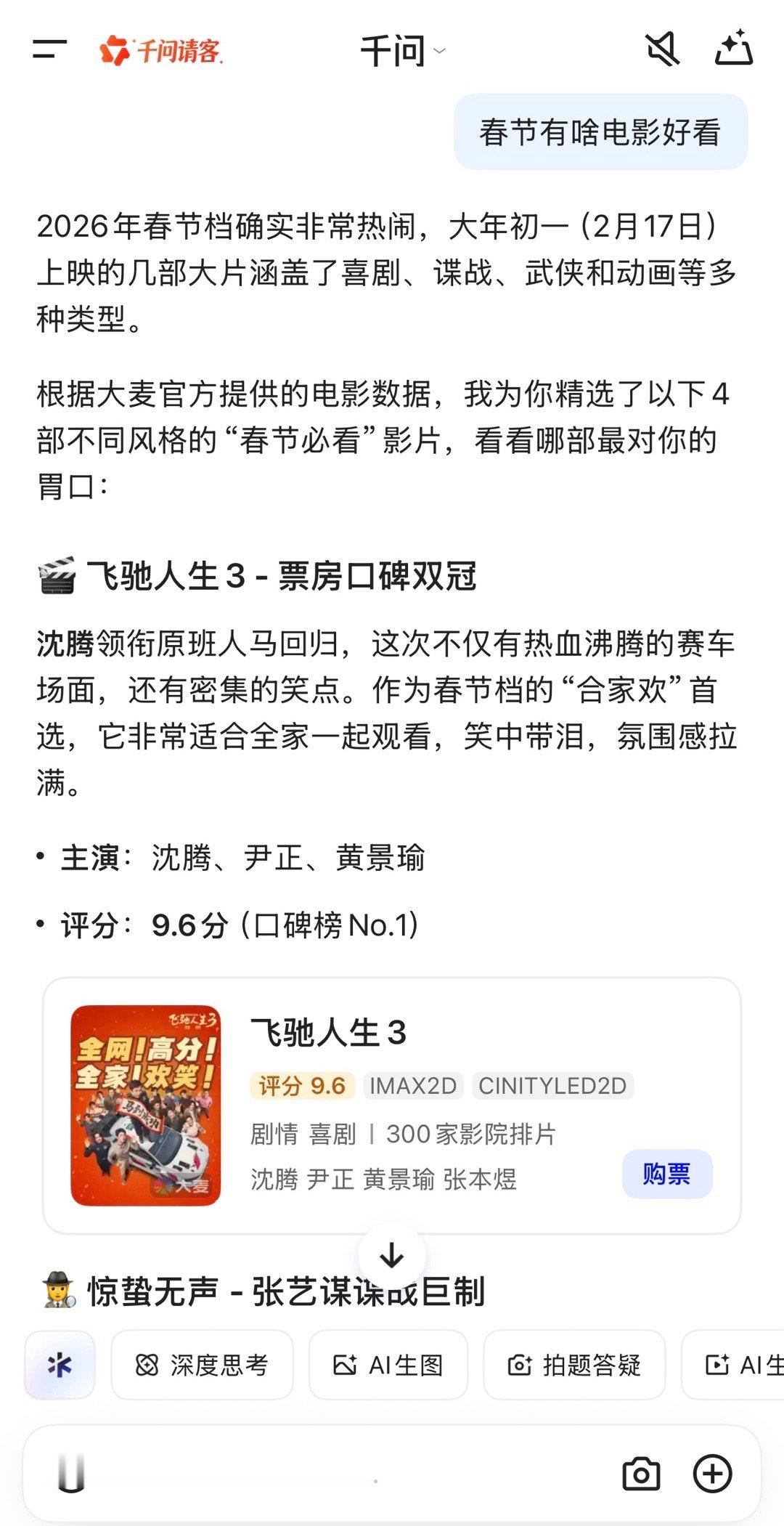 春节近尾声,大家过得都还开心吗?背靠阿里的海量生活化服务,千问和它的名字一样,千千万万,无所不能!不管是点奶茶看电影,还是订机票订酒店,之前繁琐的挑选环节,现在在千问这里只需要动动嘴一句话的事!当然其他的AI功能千问也是手拿把掐,像是AI P图和生活常识的询问,每一次,千问都能给人满满的安心感!