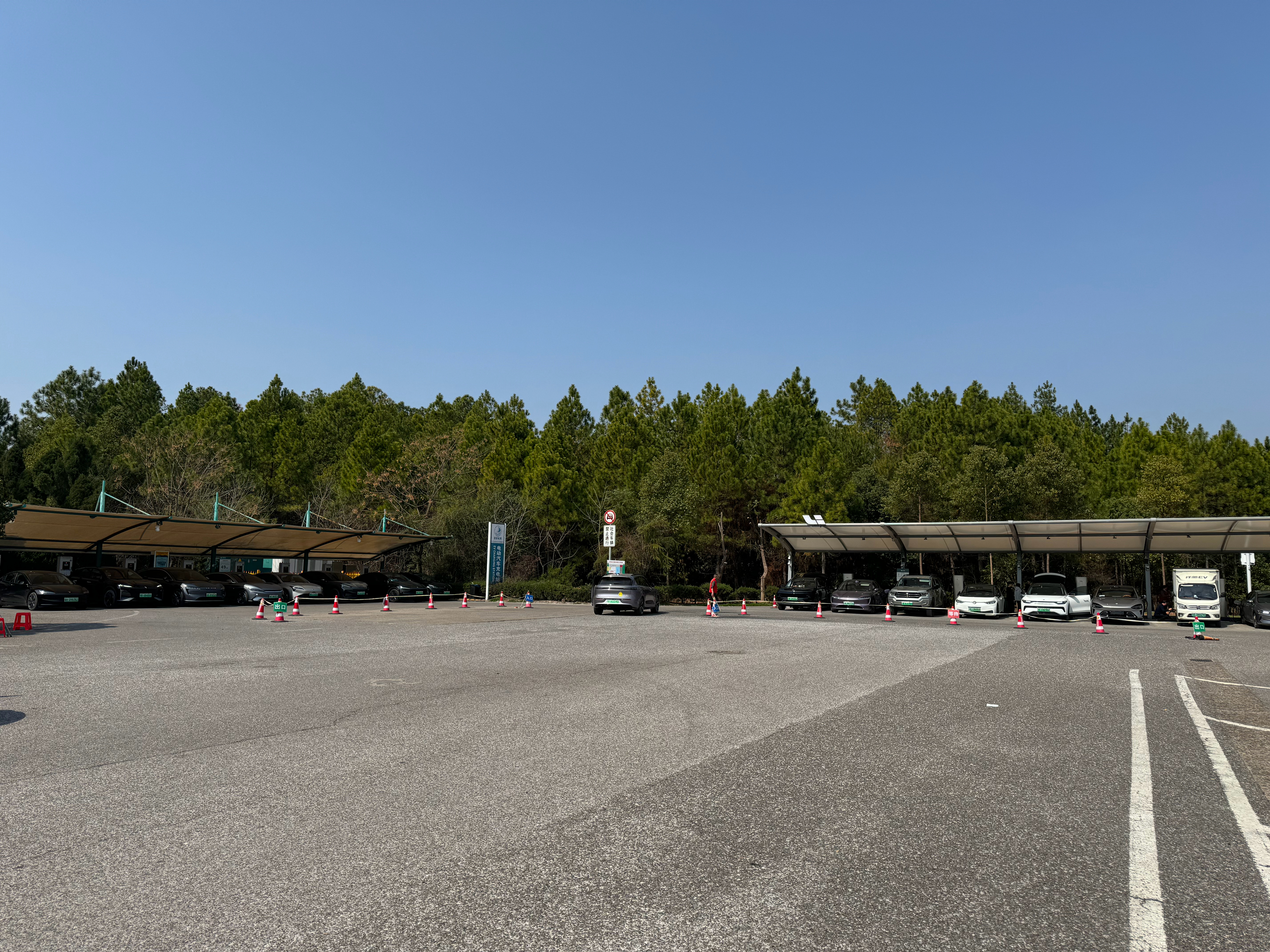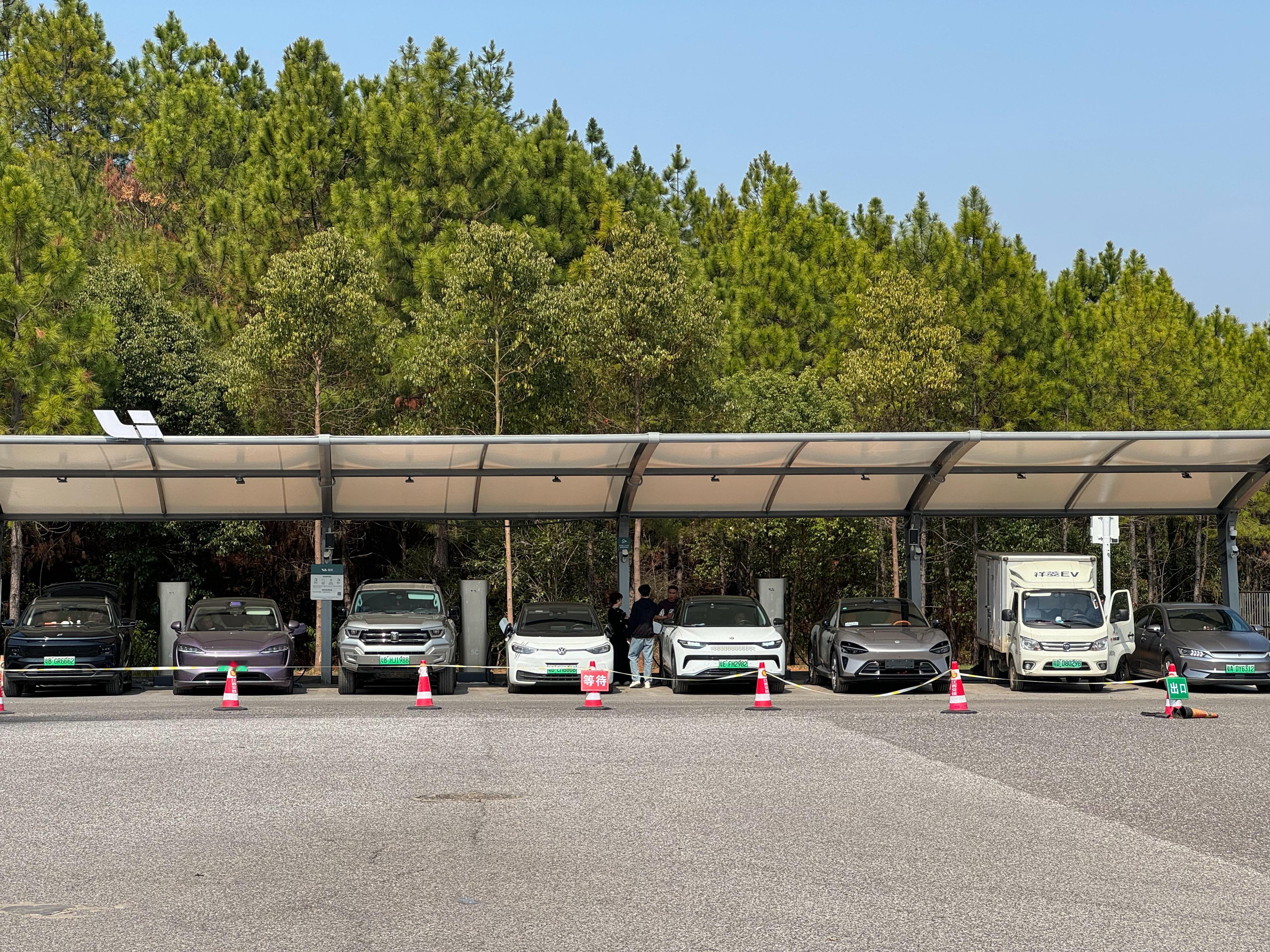 一共 16 个充电位,目前都是满的,现场也有工作人员在安排排队充电。