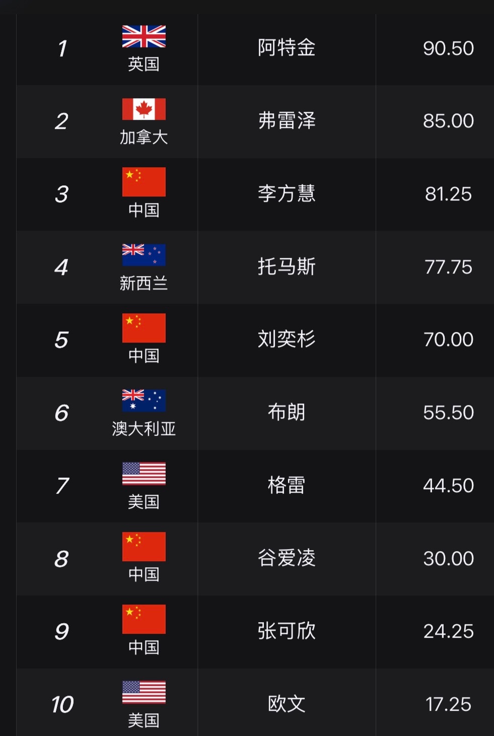 女子U型场地决赛英国选手阿特金,也是预赛的第一名,决赛第一轮就拿下90.50高分。期待谷爱凌后两轮的发挥吧!