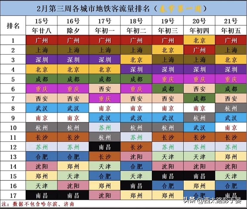 春节地铁客流榜藏着城市密码:广州“霸榜”,北京“逆袭”,重庆“异军突起” 2月第三周(春节第一周)地铁客流排名表,清晰勾勒出春节期间城市活力的流动轨迹。 从年廿八到年初四,广州连续5天稳居榜首,上海紧随其后,一线城市的“主场优势”十分明显。直到年初四,北京才凭借返程高峰首次反超广州,而年初五广州又迅速夺回第一,展现出超强的人口吸引力和交通韧性。 值得关注的是,重庆在年初三后异军突起,从第6名跃升至第5名并保持稳定,成都、西安、武汉等新一线城市则在榜单中交替发力。年初一,西安冲进前六;年初三,重庆超越成都;年初四,西安重回前六,反映出春节期间旅游和返乡客流的多元流向。这些城市凭借独特的文旅IP和便捷的地铁网络,成为游客打卡的热门目的地。 从时间维度看,除夕到年初二,客流格局相对稳定,广州、上海、深圳、北京牢牢占据前四;年初三开始,随着旅游热潮和返程启动,重庆、西安等城市排名明显提升,城市活力的“接力棒”开始在不同区域间传递。 这组数据不仅是地铁客流的晴雨表,更折射出春节期间人口流动的深层逻辑:一线城市是人口流动的核心枢纽,而新一线城市则凭借旅游吸引力和产业优势,成为承载活力的重要节点。当列车穿梭在城市地下,承载的不仅是归乡与返程的人流,更是城市发展的脉搏与希望。 地铁客流排行榜