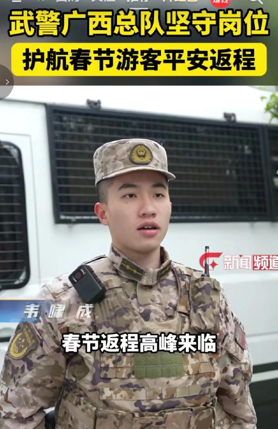 为了护航春节游客平安返程。武警广西总队坚守岗位据悉,2026年春节期间,武警广西总队南宁、桂林、崇左等支队均加强了执勤部署,在高铁站、机场、景区等重点区域开展武装巡逻,通过定点执勤与动态巡逻结合的方式排查安全隐患,同时为旅客提供搬运行李、指引路线等暖心服务,全力保障春运返程期间的出行安全与秩。(来源于@广西新闻频道 )